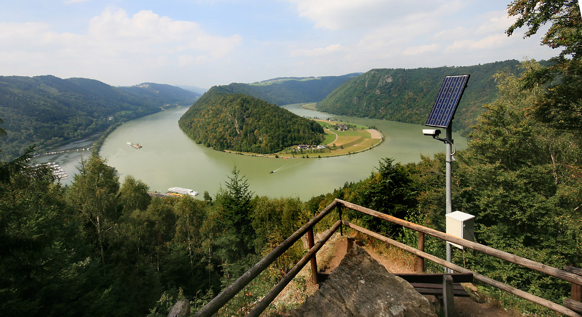 Einige Bilder aus der Schlögener Donauschlinge. Die Donau ändert hier zweimal ihre Richtung um 180°. Vom erhöhten Fotostandpunkt aus kann man die Schiffe daher binnen weniger Minuten von beiden Seiten fotgrafieren.