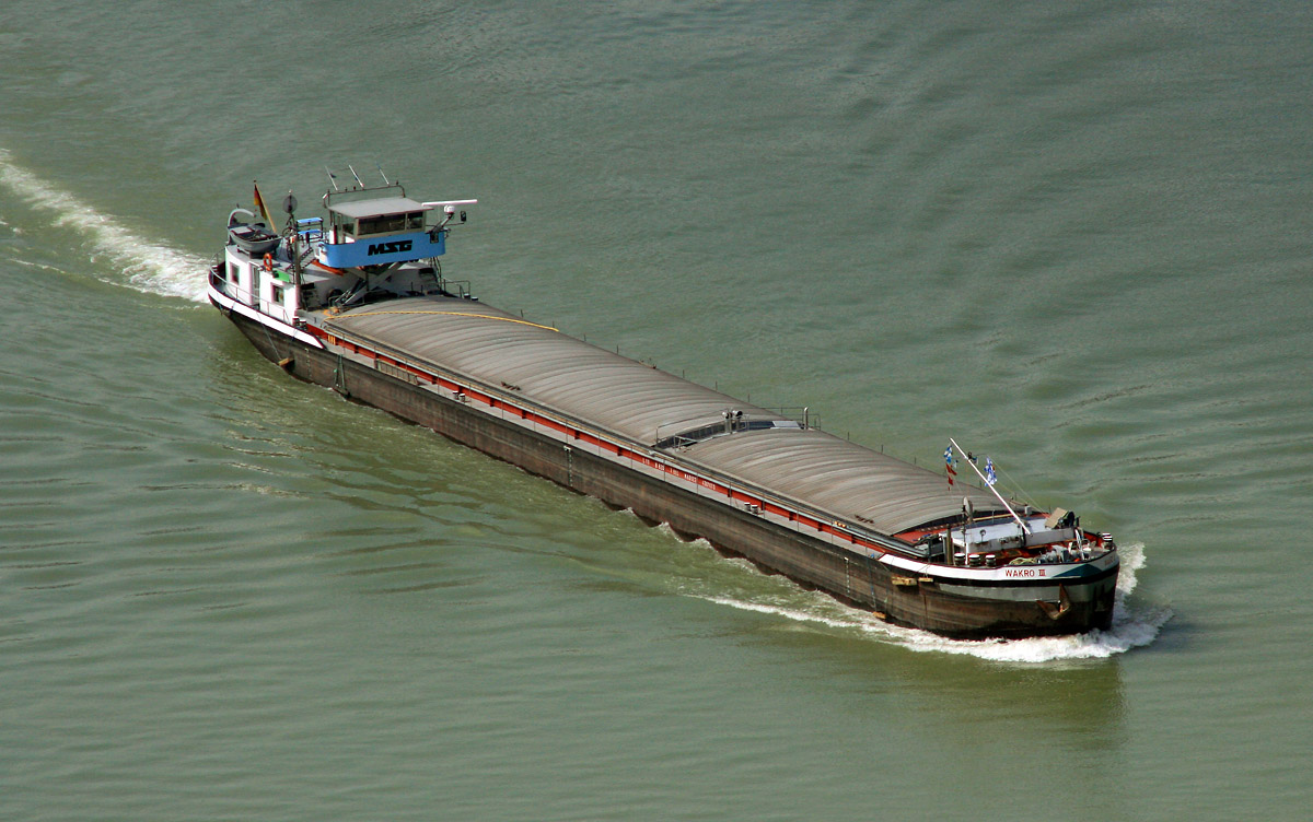 MS Wakro III der MSG Mainschiffahrts-Genossenschaft, Länge 77 m, Breite 8,2 m, BJ. 1954 Das Schiff wurde 2008 verkauft und heißt heute ANNA HERBERT
