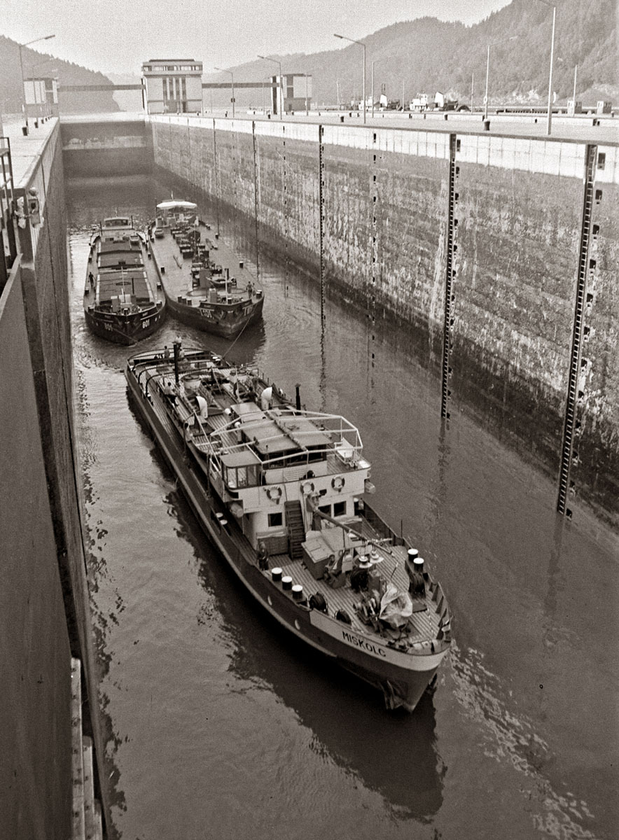 Mit dem Bau der Donaukraftwerke wurde die Fahrt der Schleppzüge erheblich erschwert. MS Miskolc, Länge 48 m, Breite 9,8 m, Bj. 1961 beim Schleusen durch das Kraftwerk Aschach. Das Schiff wurde 1965 zu einem Schubschiff umgebaut. Praktica FX II, Meyer Lydith 30 mm, 1963
