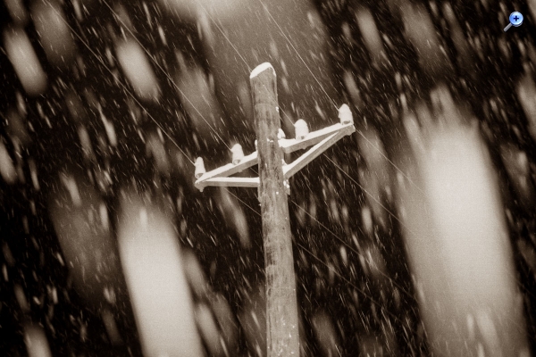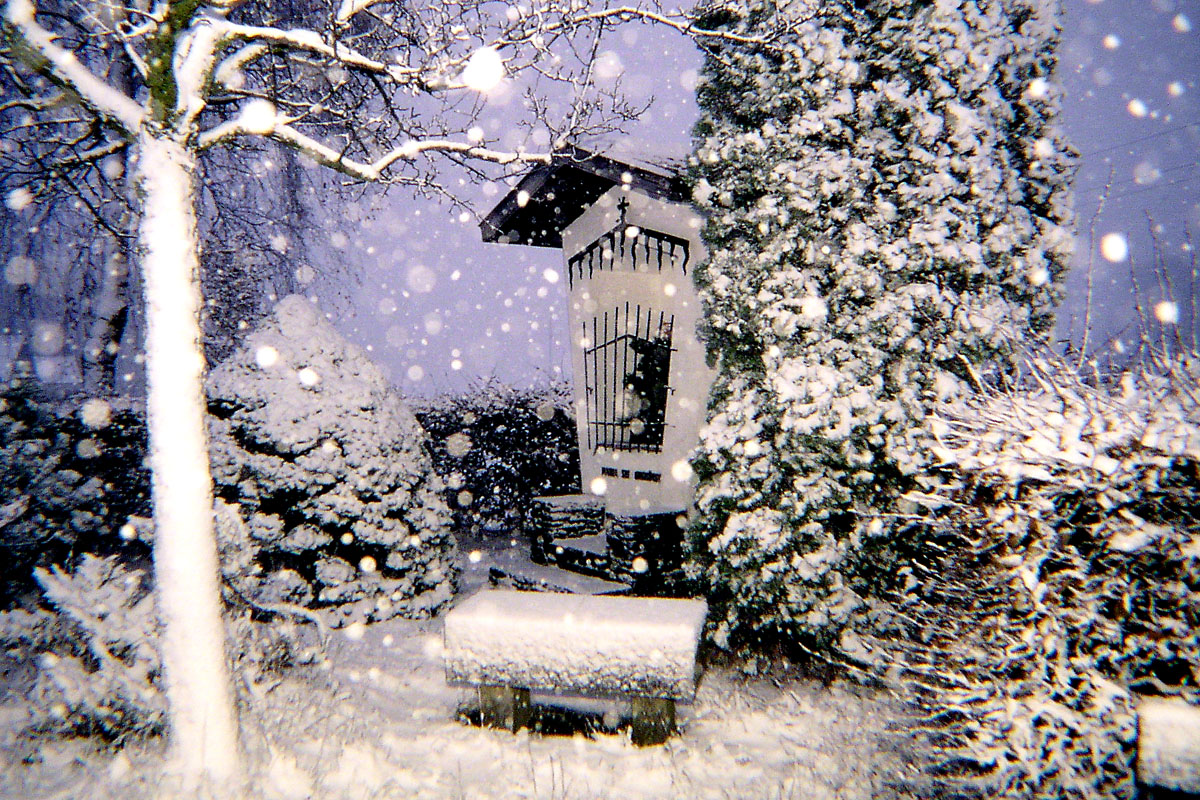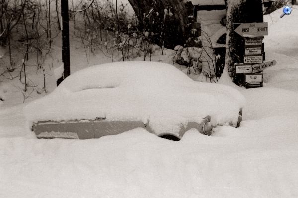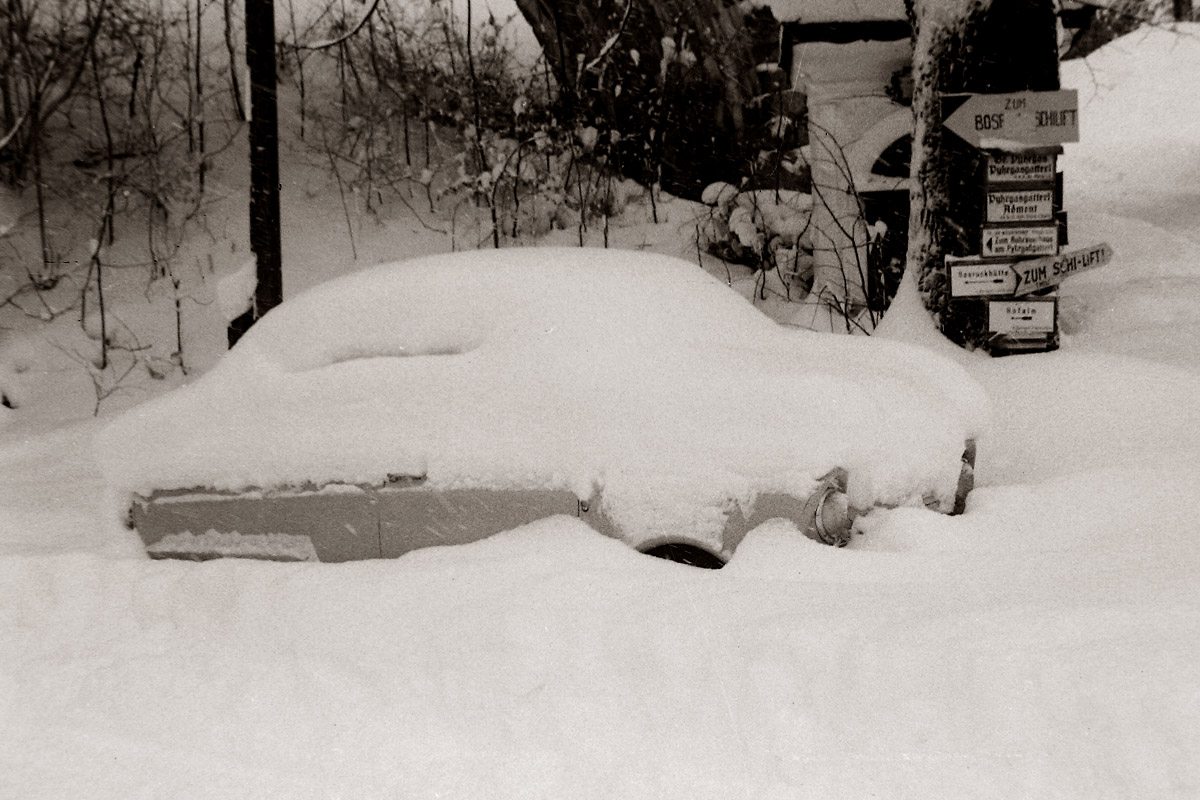 Aber die Schneefälle von früher hatten auch ihren Reiz. Vor genau 50 Jahren habe ich bei starkem Schneegestöber meinen damals schon älteren Birnchenblitz ausgegraben um mit der längeren Abbrennzeit ein wenig Bewegung in die Bilder zu bekommen.