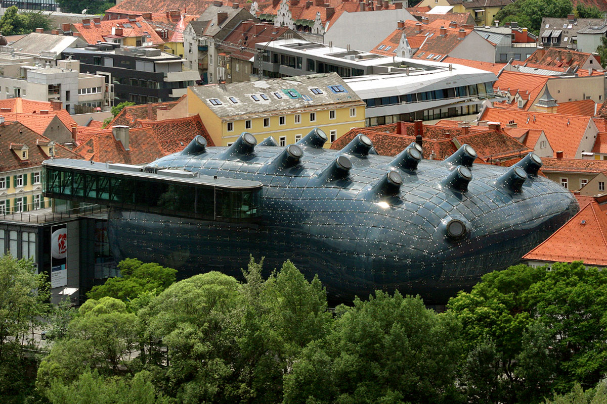 Dazwischen ein modernes Bauwerk : Das Kunsthaus in "Blob-Architektur" (2003)