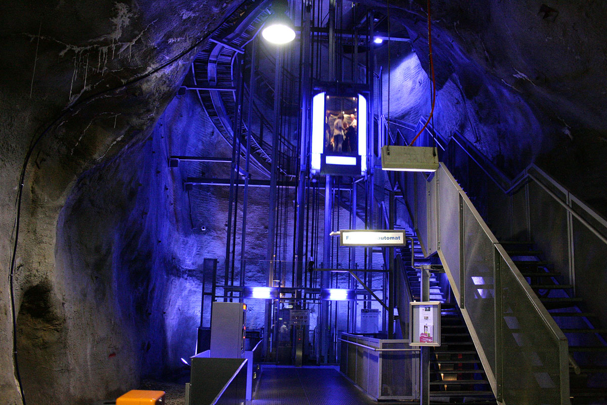 Den Uhrturm erreicht man im Berginneren mit einem futuristischen Lift