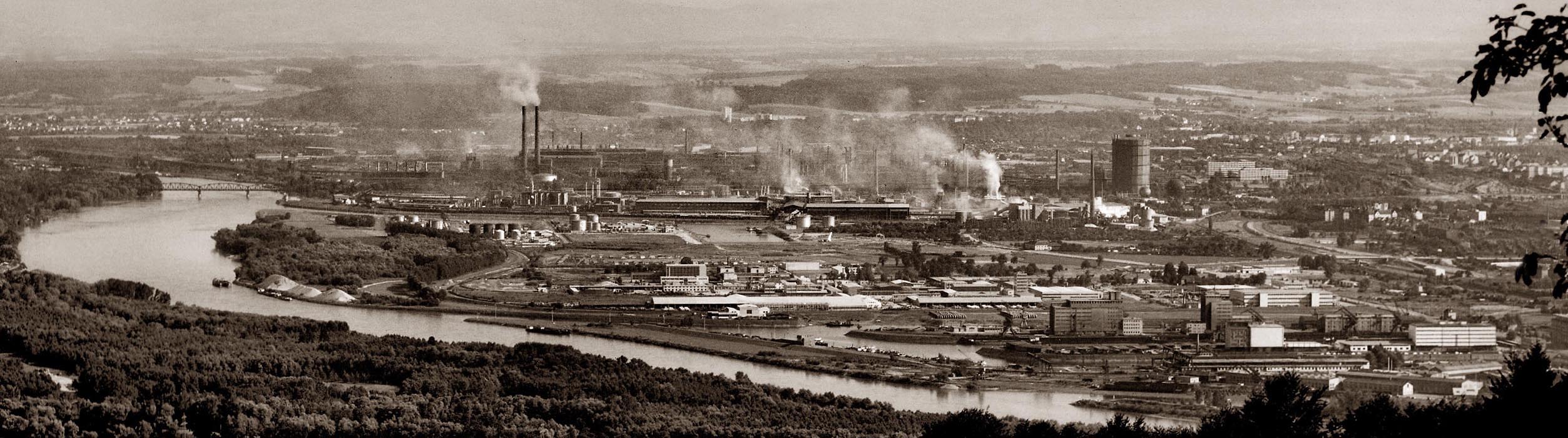 Eine Ansicht des Industriegeländes der Stadt Linz a.d. Donau vor 50 Jahren. Damals war stinkender Industrierauch noch ein Statussymbol.