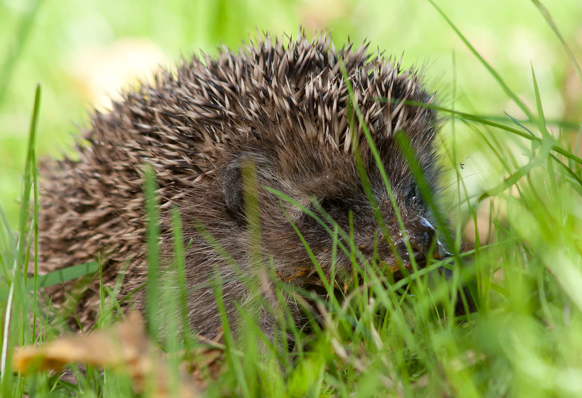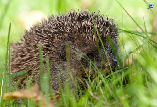 Ein Igel sucht im hohen Gras nach Nacktschnecken