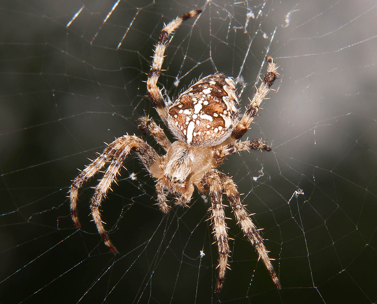 Eine Kreuzspinne wartet im schon arg zerzausten Spinnenetz auf Beute
