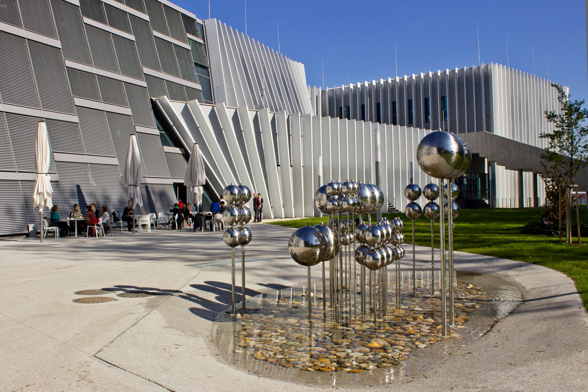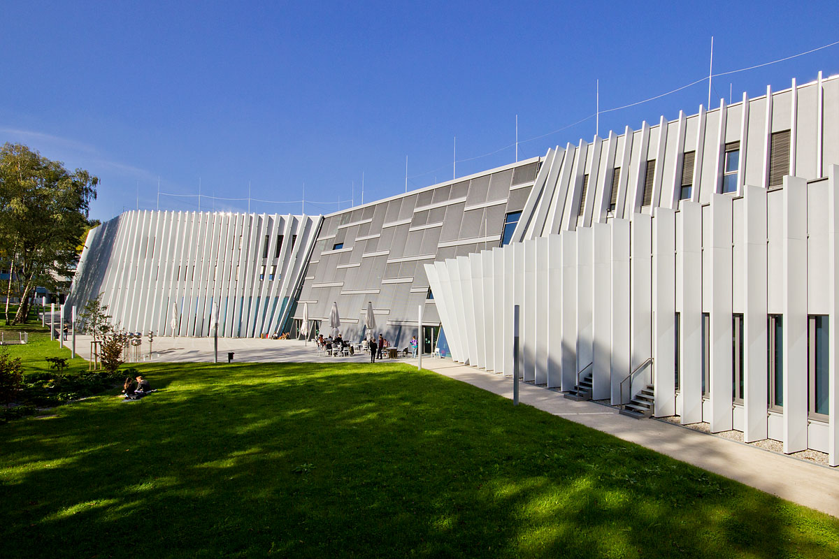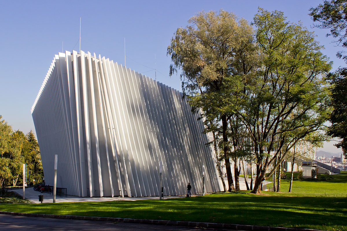 Die neue Anton Bruckner Musikuniversität in Linz forderte in dieser Hinsicht die Möglichkeiten moderner Digitalkameras bis zur machbaren Grenze heraus: Weiße Fasadenelemente inmitten alter Baume.