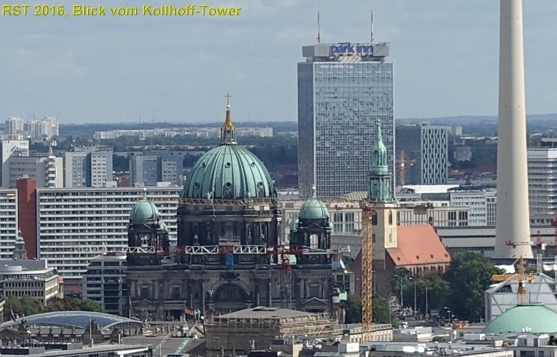 Ausschnitt: Noch näher dran. Glasdach links vorn: Deutsches historische Museum (Zeughaus), Berliner Dom, Marienkirche, "Park Inn" Hochhaus am Alex, Fernsehturm.