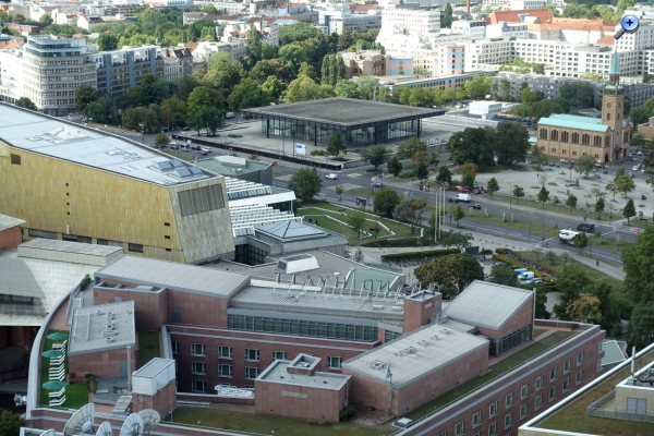 Im Vordergrund das Kulturforum von Berlin mit von links: Neue Nationalgalerie, Matthäus-Kirche, Kupferstichkabinett. Im Hintergrund die City West.
