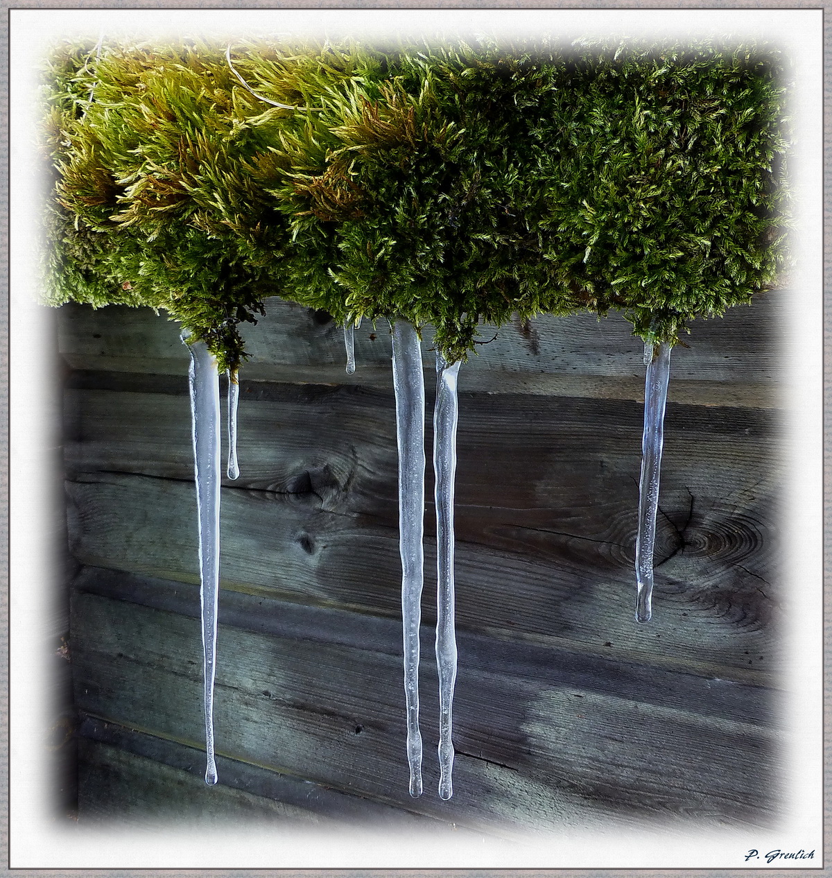 Noch was. Tauwasser, das von einem mit Birkenrinde gedeckten und mittlerweile bemoosten Hüttendach tropfte und dann nochmal gefroren ist. Sieht ungewöhnlich aus, oder? Ich nenn das Bild mal einfach Mooszapfen.