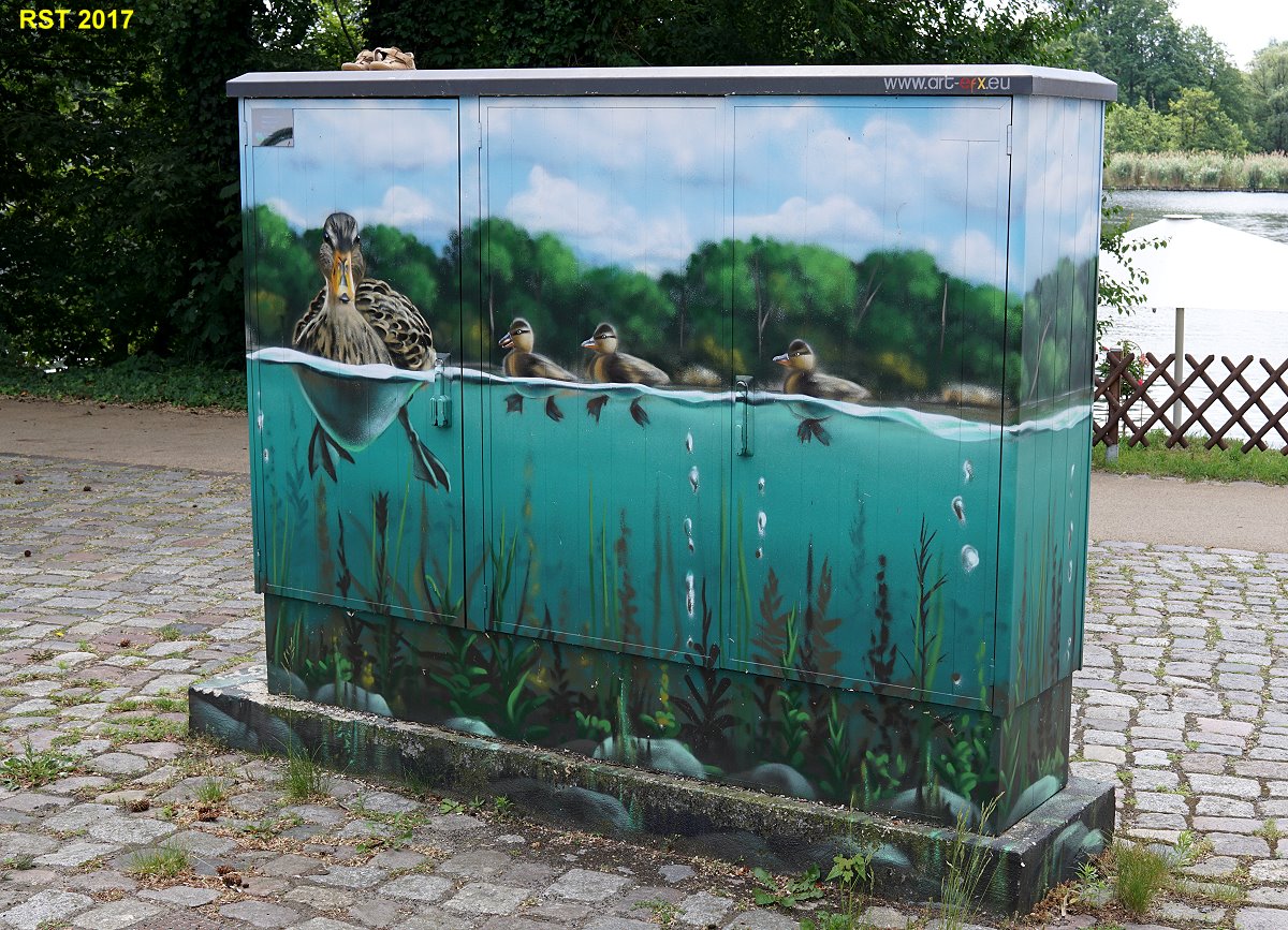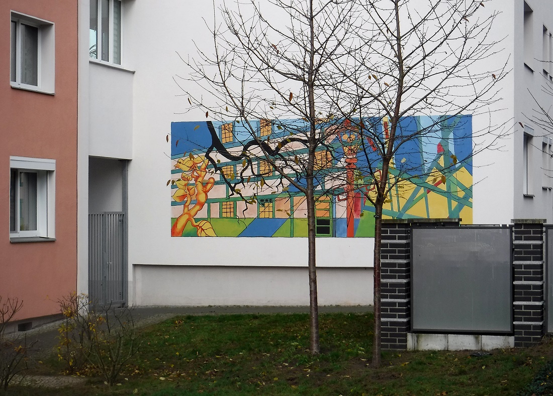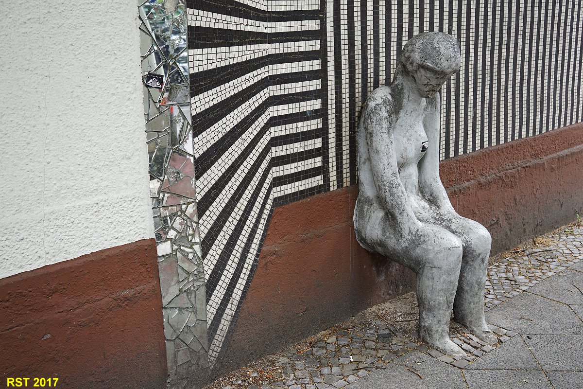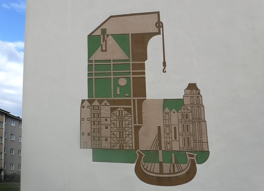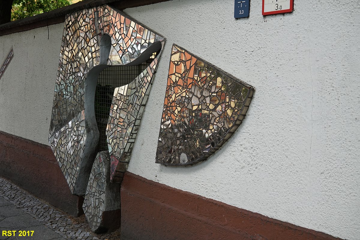 Man fährt ständig an dieser Hauswand vorbei und bekommt diese Grafik nicht mit. Erst jetzt (ich mußte wegen eines Müll-Wagens an dieser Stelle im PWK warten und sah dann das "Kunstwerk?) und habe es durch das Seitenfenster "geknipst". Charme der fünfziger Jahre.