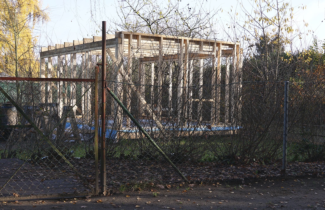 Mutiger Aufbau eines Gartenhauses mitten im Winter.