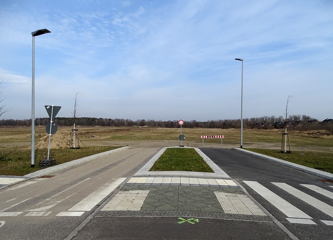 ein Blick von einem sanierten Kreisverkehr in eine Straße ins nirgendwo. Aufgenommen in Falkensee bei Berlin.
