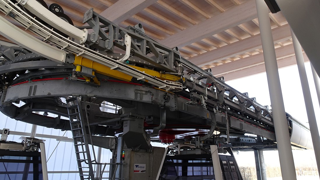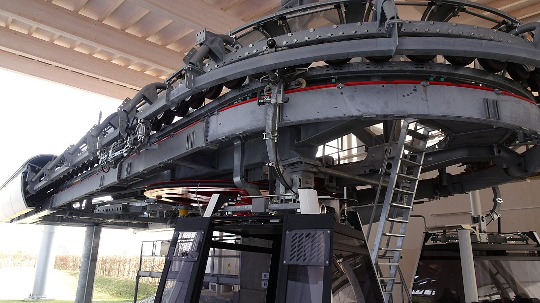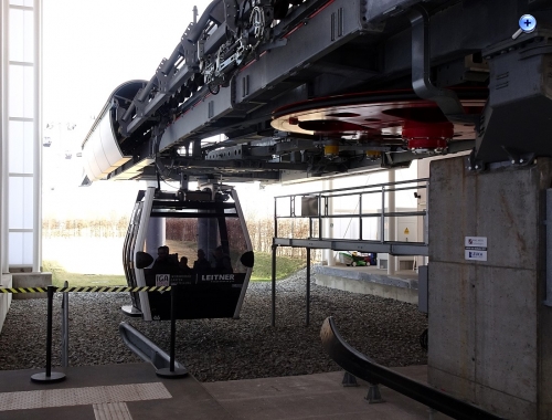 Es gibt 64 Kabinen, davon sechs mit Glasboden, die pro Richtung 3000 Personen pro Stunde befördern können, pro Kabine max. 10 Menschen.