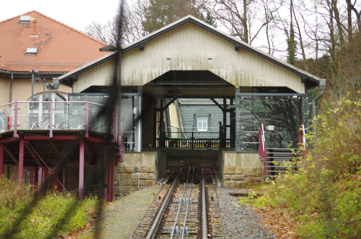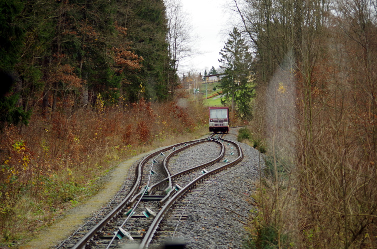 Zur Standseilbahn: Interessant ist bei diesen Mittelstrecken-Ausweichstellen, dass man dort gut sieht, die Wagons müssten eigentlich aus den Schienen springen. Tun sie aber nicht, weil die jeweiligen Aussenräder eine Mittelrille haben und die Innenräder Walzen. Also nur die Aussenräder fuhren den Wagon auf der Aussenschiene. Technisch bemerkenswert.
