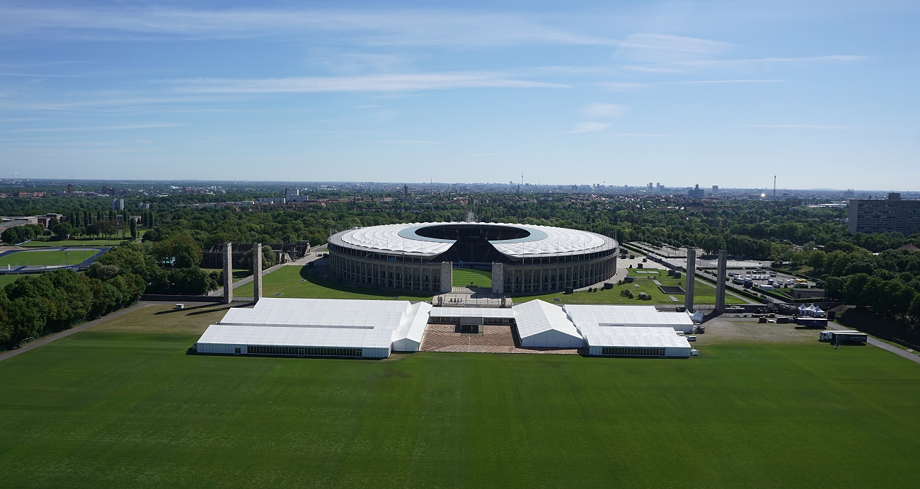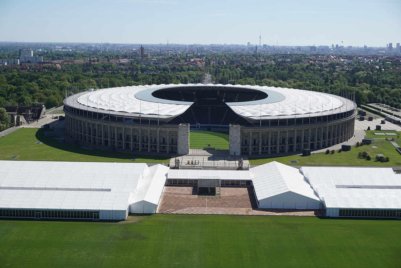 Das Berliner Olympia-Stadium. Davor Zelte für das kommende Fußball-Pokalspiel. Gegenlichtaufnahme.