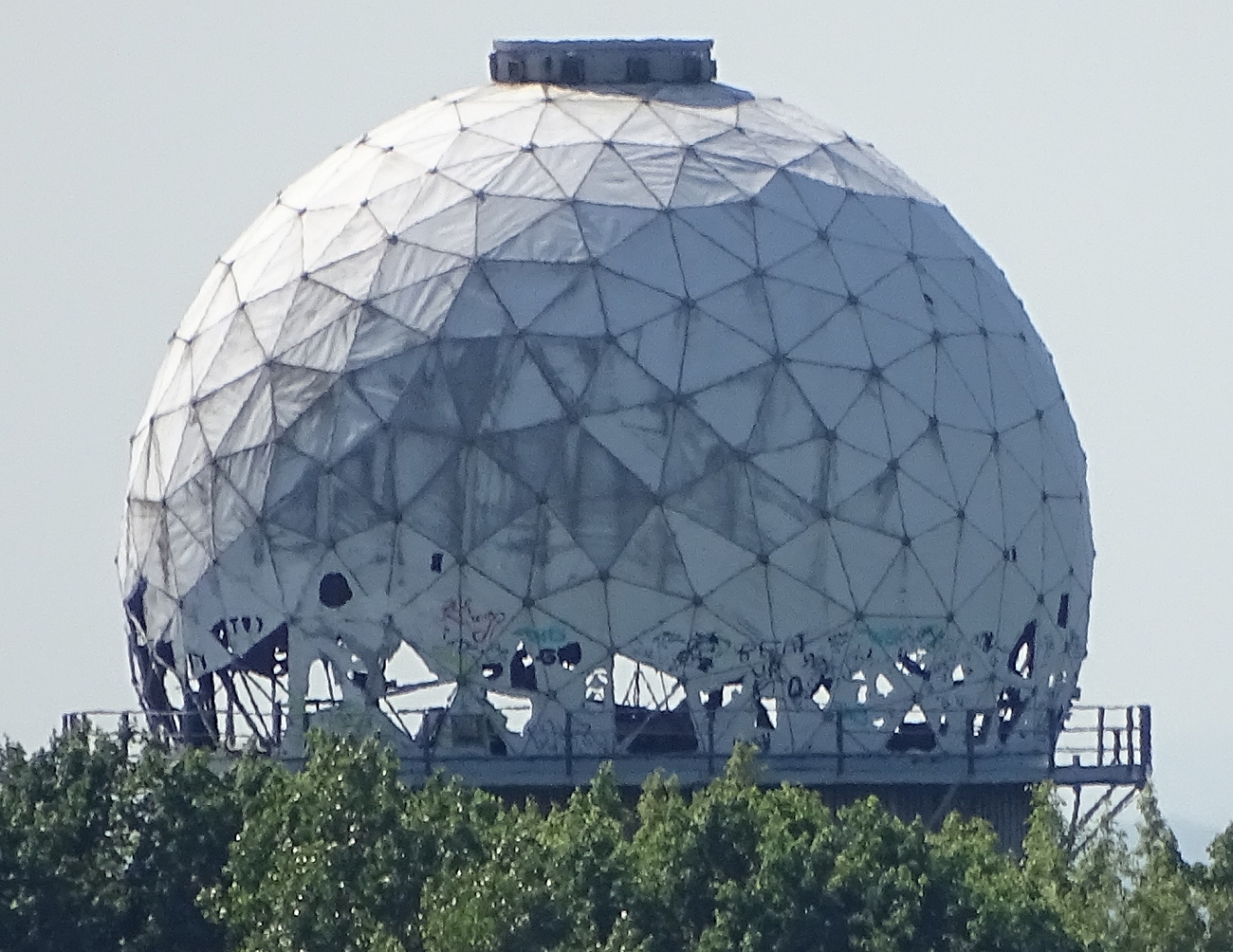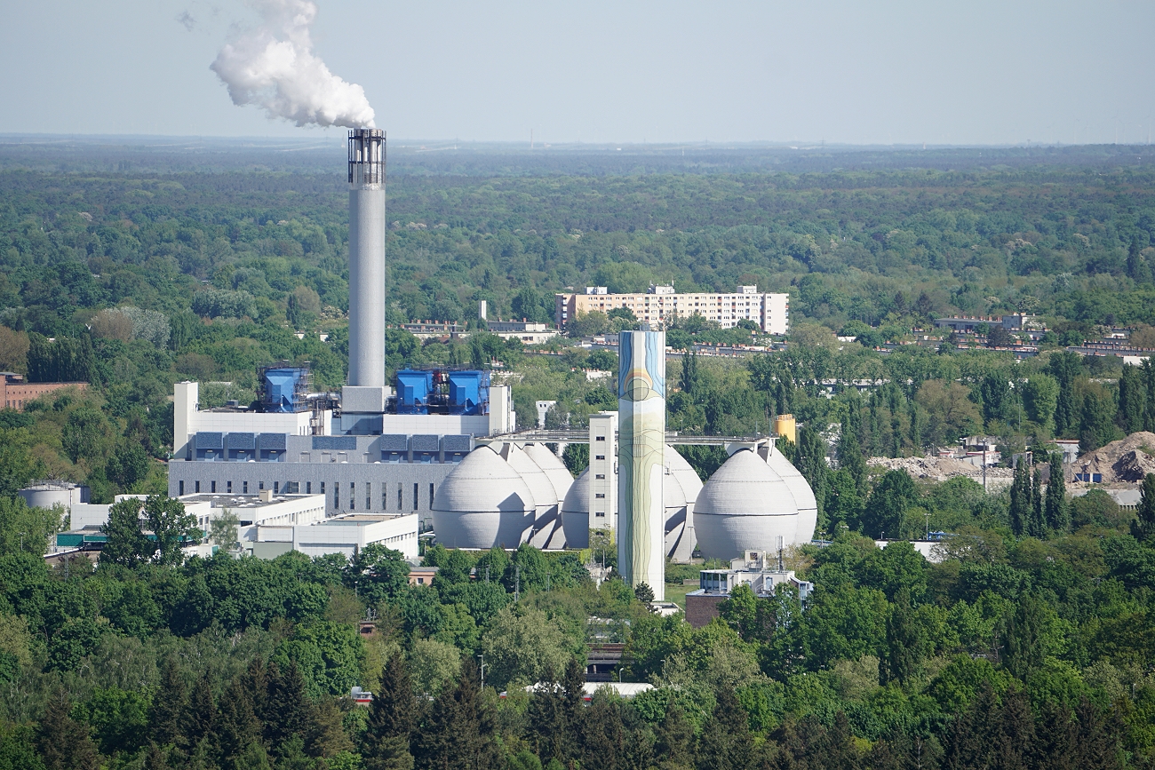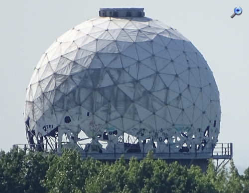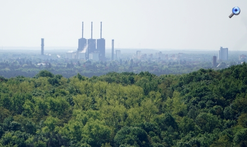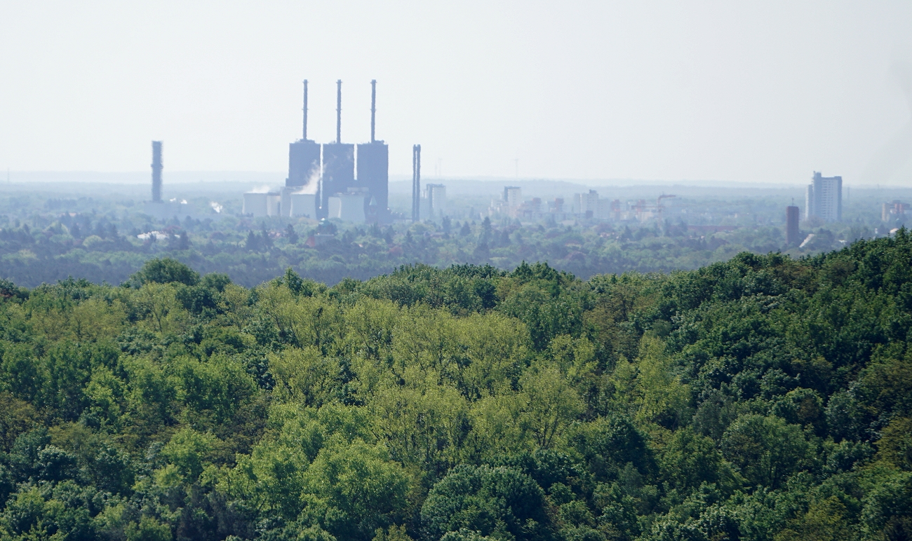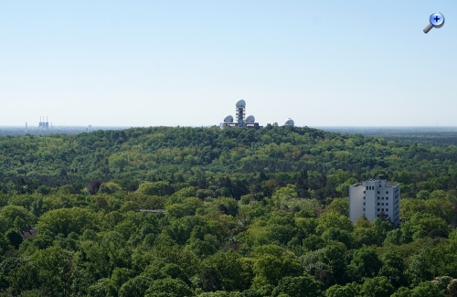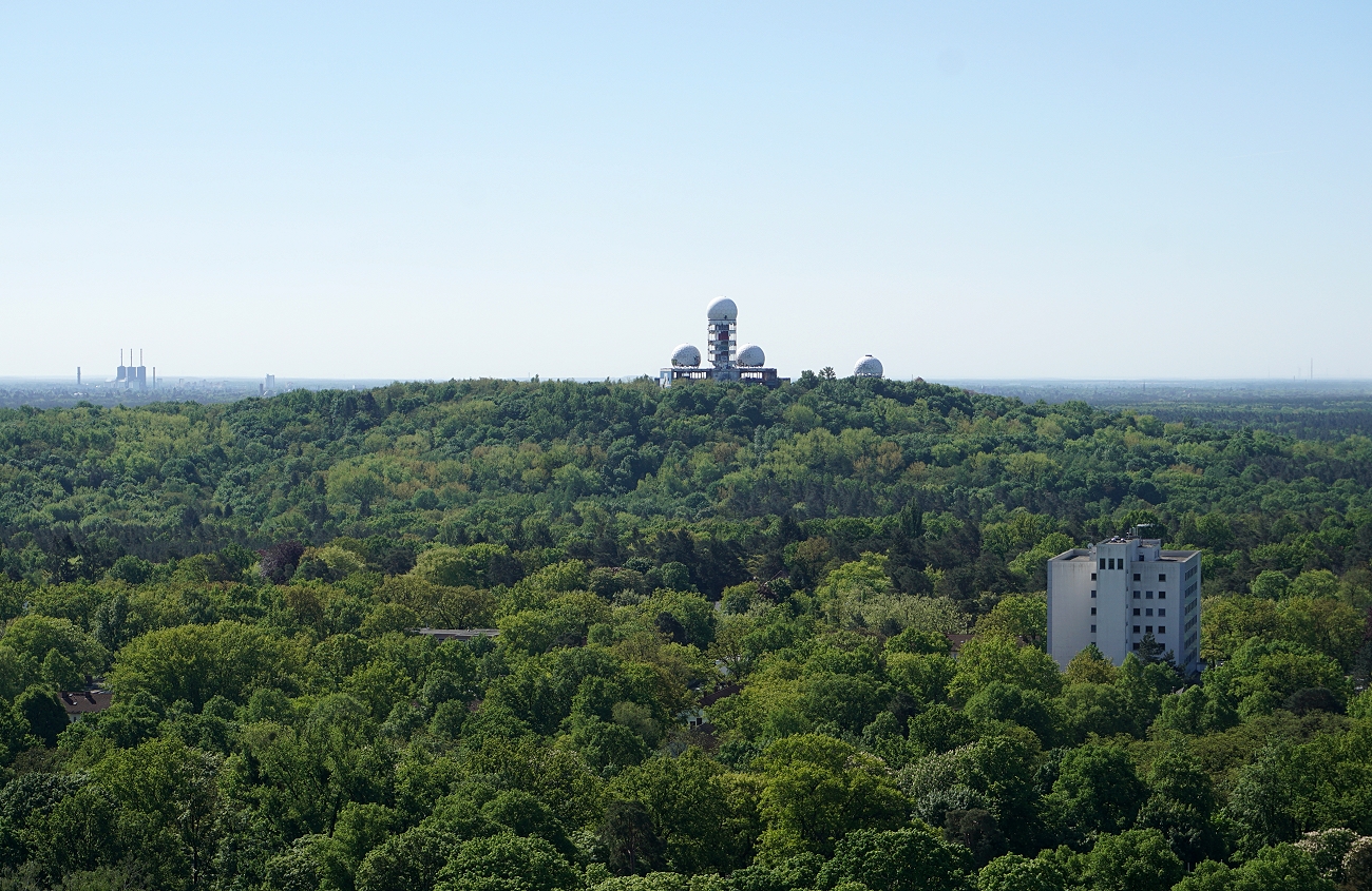 Teufelsberg mit ehemaliger US-Abhörstation. Links: Das Heizkraftwerk Lichterfelde, 11 km entfernt.