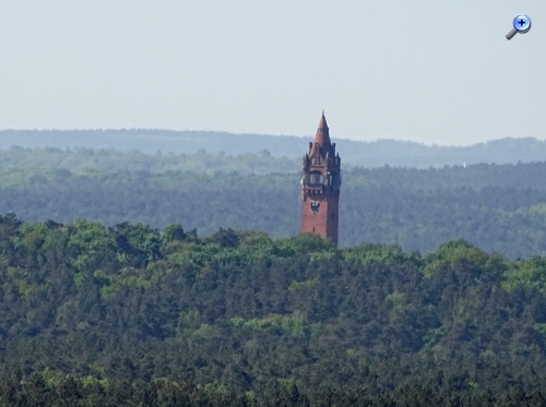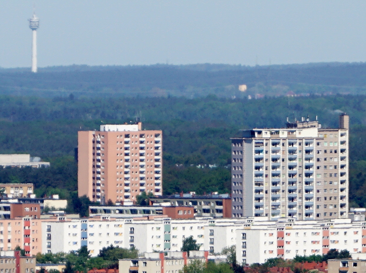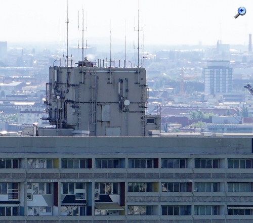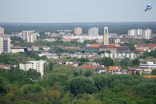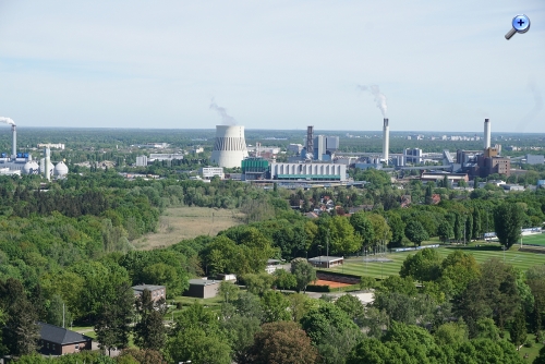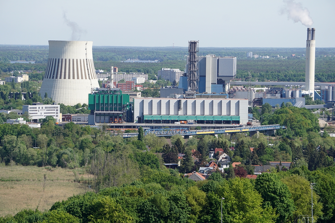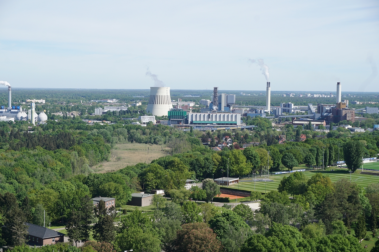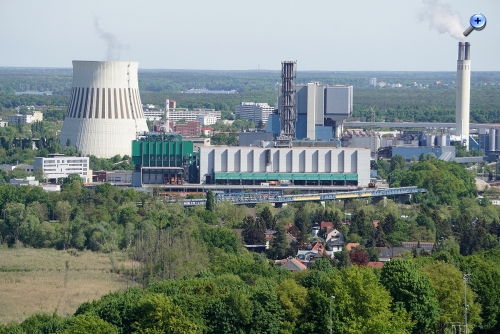 Teufelsberg mit ehemaliger US-Abhörstation. Links: Das Heizkraftwerk Lichterfelde, 11 km entfernt.