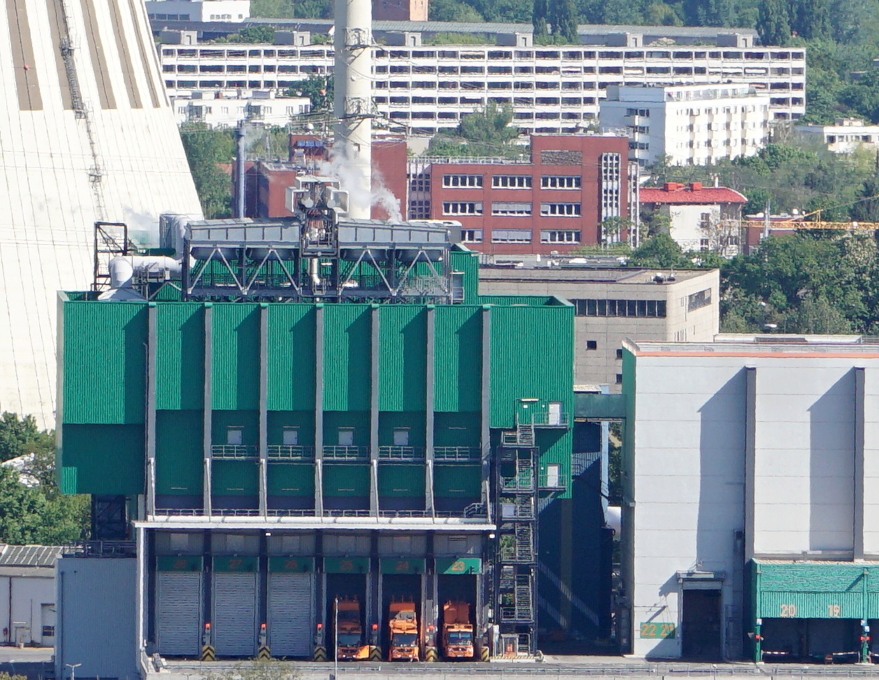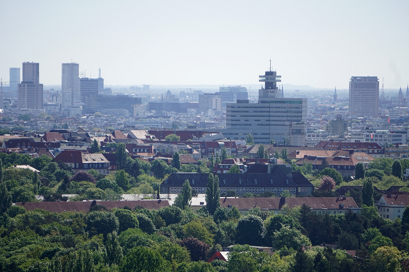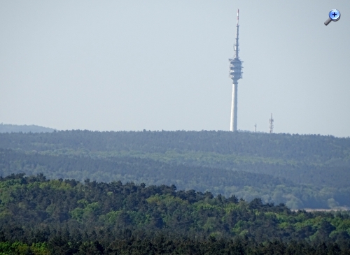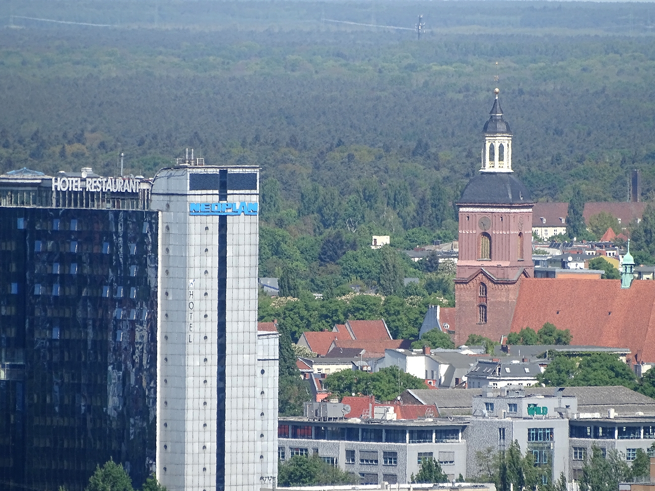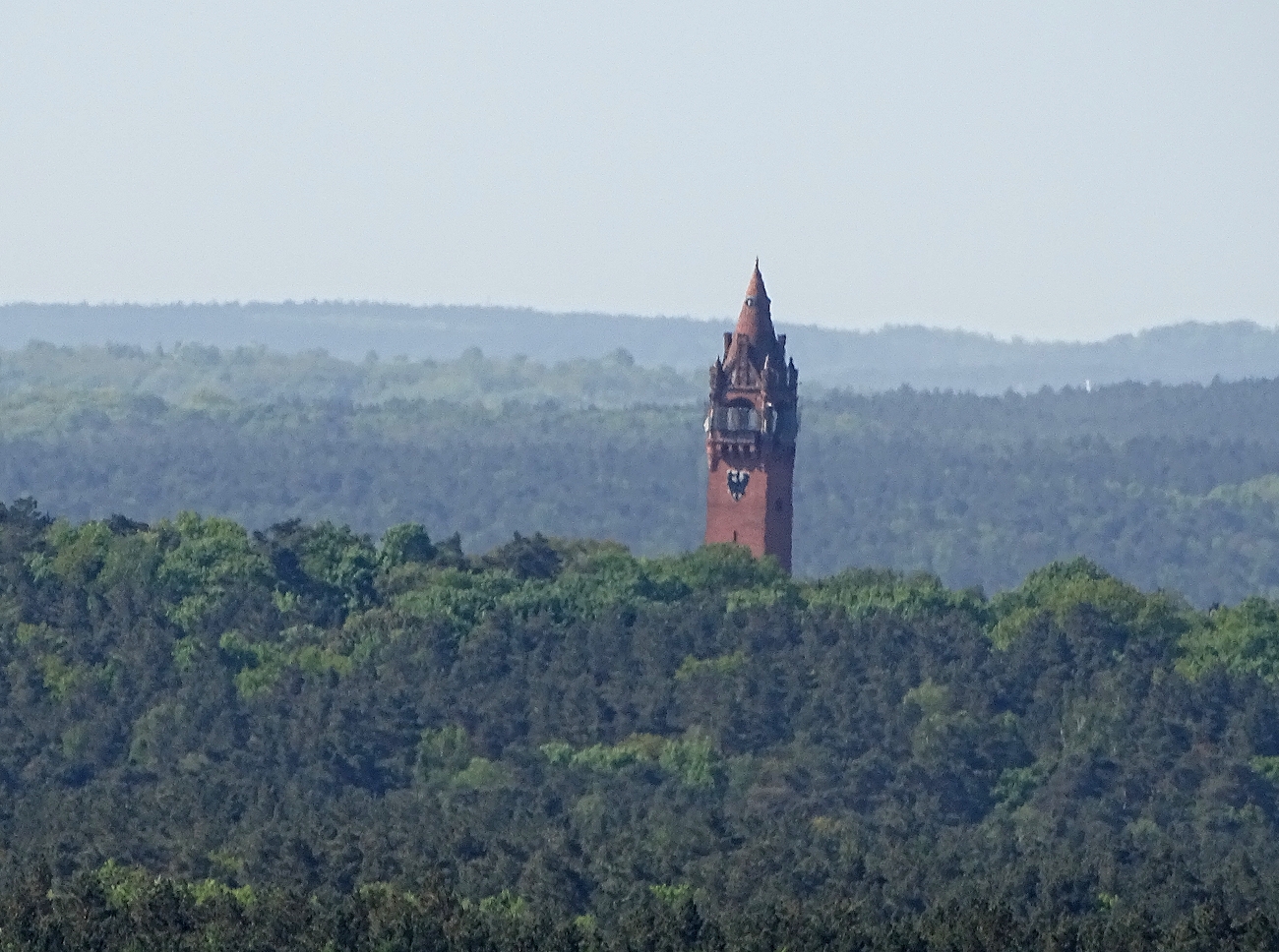 Teufelsberg mit ehemaliger US-Abhörstation. Links: Das Heizkraftwerk Lichterfelde, 11 km entfernt.