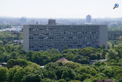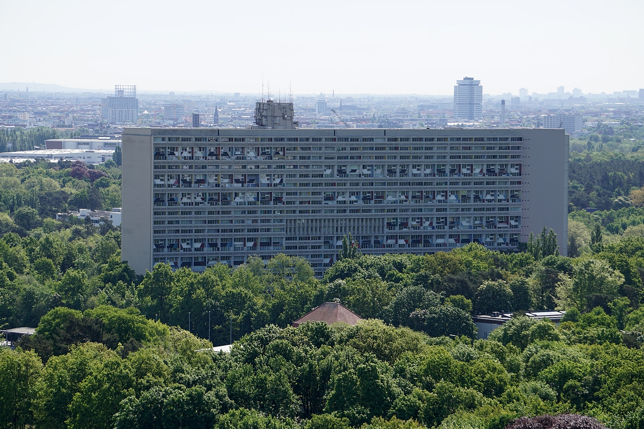 Blick nach West-Süd-West: Das Corbusier-Haus, gebaut 1958 (Internationale Bauausstellung 1957), 530 Wohnungen (teilweise mit mehren Etagen pro Wohnung), 17 Stockwerke. Gegenlichtaufnahme.