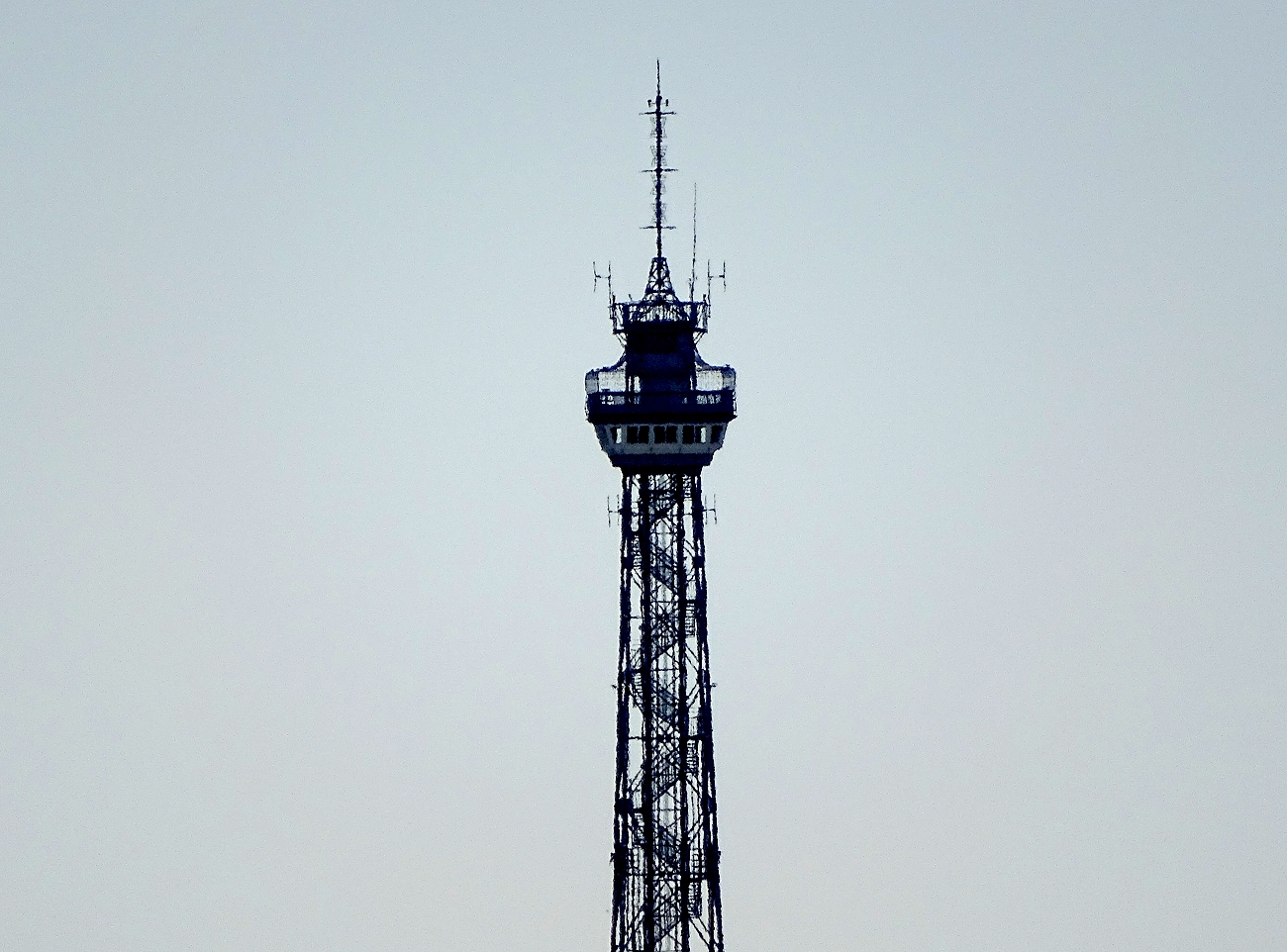 soweit mir bekannt, ist der Turm 77 Meter hoch, allerdings ist der Punkt, wo ich die Aufnahmen machte, nicht oben drauf, sondern bei den Schlitzen, die nach Westen zeigen, einige Meter tiefer gewesen. Man hätte vom Fahrstuhlausstieg noch ca 10 Meter nach oben steigen müssen (an der Glocke vorbei) auf das "Dach". Da es noch kalt und windig war, habe ich mir das erspart