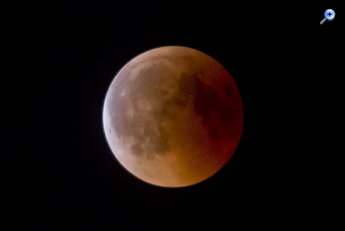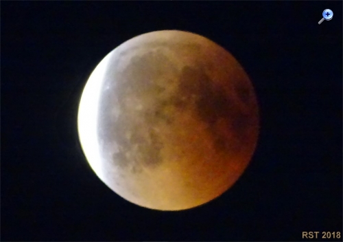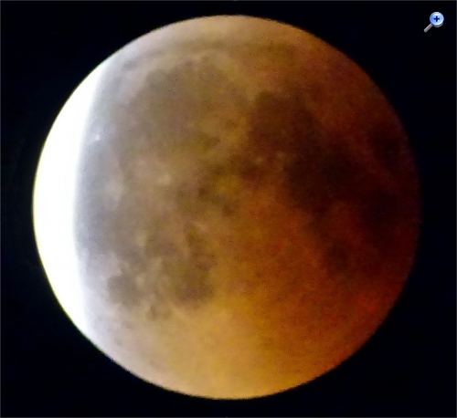 Willi:Im Oberösterreichischen Donautal waren die Beobachtungsbedingungen durch Wolken auch stark eingeschränkt. Erst gegen Ende der Totalität waren brauchbare Bilder des verfinsterten Mondes möglich. Da auch mein Sohn seine Vollformat EOS 6D mit dem hochwertigen Tamron SP Objektiv einsetzte war ein intrressanter Vergleich Vollformat versus APS-C mit einem alten 400 mm Festbrennweitenobjektiv möglich. ,,, Das war wegen der dichten Wolken zum Beginn der Finsternis nicht möglich.