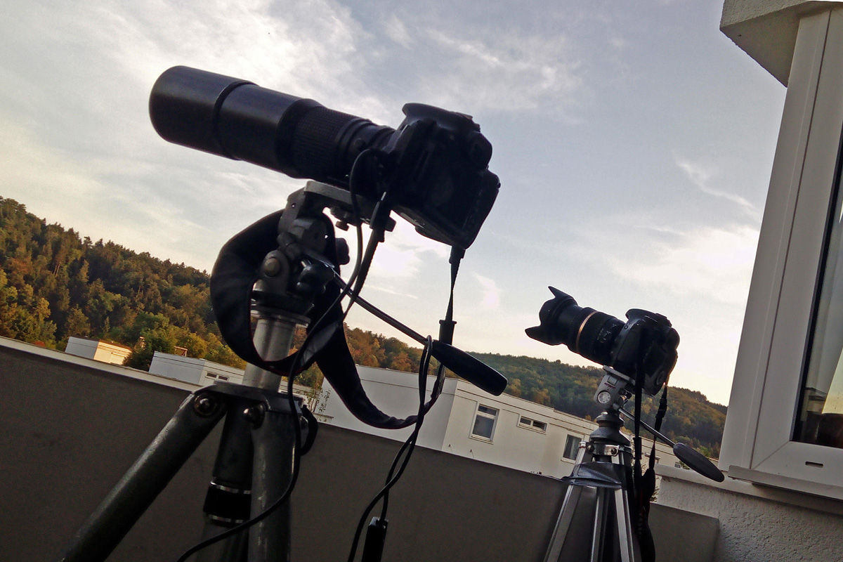 Die Canon EOS 600D mit dem 30 Jahre alten Tokina RMC 400 mm sollte für die Mondfotos eingesetzt werden, die EOS 7D mit dem Tamron SP 1:2,8/17-50 mm für Reihenaufnahmen der Mondbahn im 4 Minuten Abstand. Das war wegen der dichten Wolken zum Beginn der Finsternis nicht möglich.