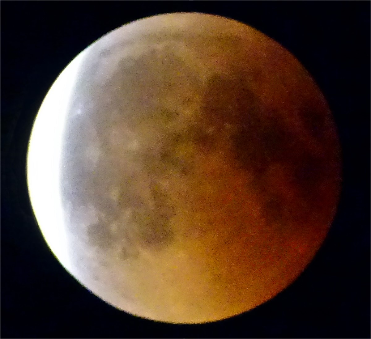 Der rote Mond kurz vor dem Austritt aus dem Kernschatten. Durch die starke Luftunruhe nach dem heißen Nachmittag sind nur wenige Details erkennbar. EOS 600D, Tokina RMC 400 mm , Bl. 8, 1 sek. ISO 1600, (Ausschnitt aus dem 18 Megapixel RAW File)