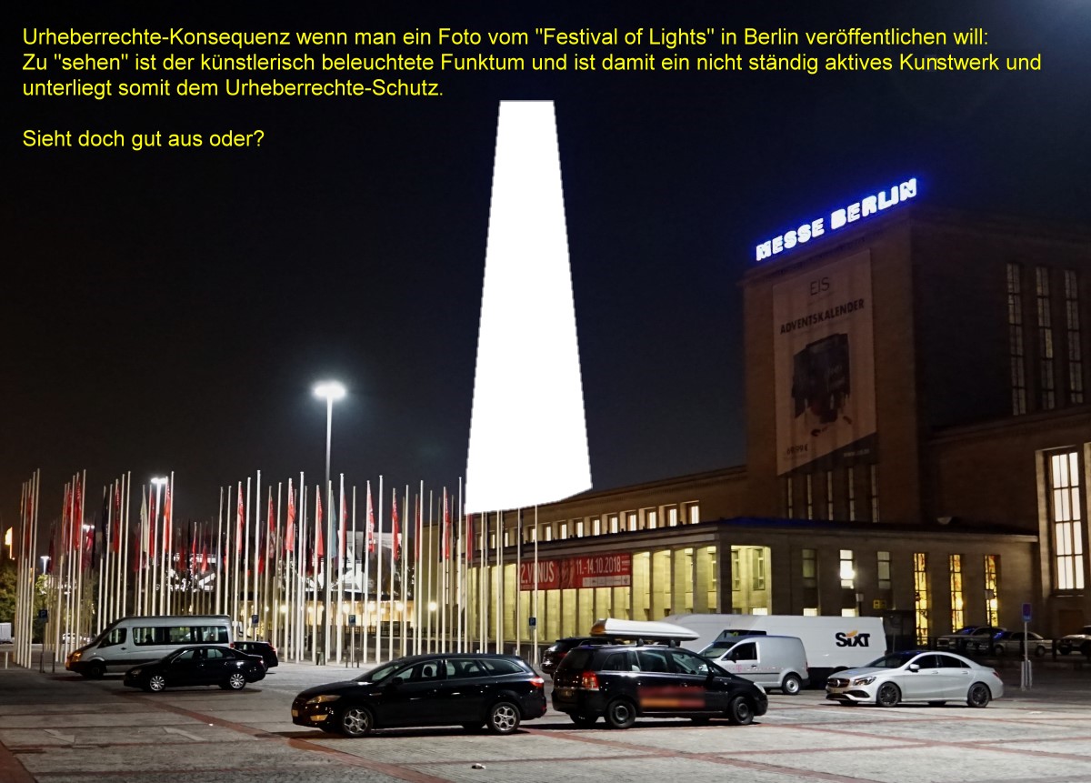 Durch die Beleuchtung ist wohl ein schützenswertes nicht dauerhaftes Kunstwerk entstanden und Fotos davon dürfen nicht veröffentlicht werden.