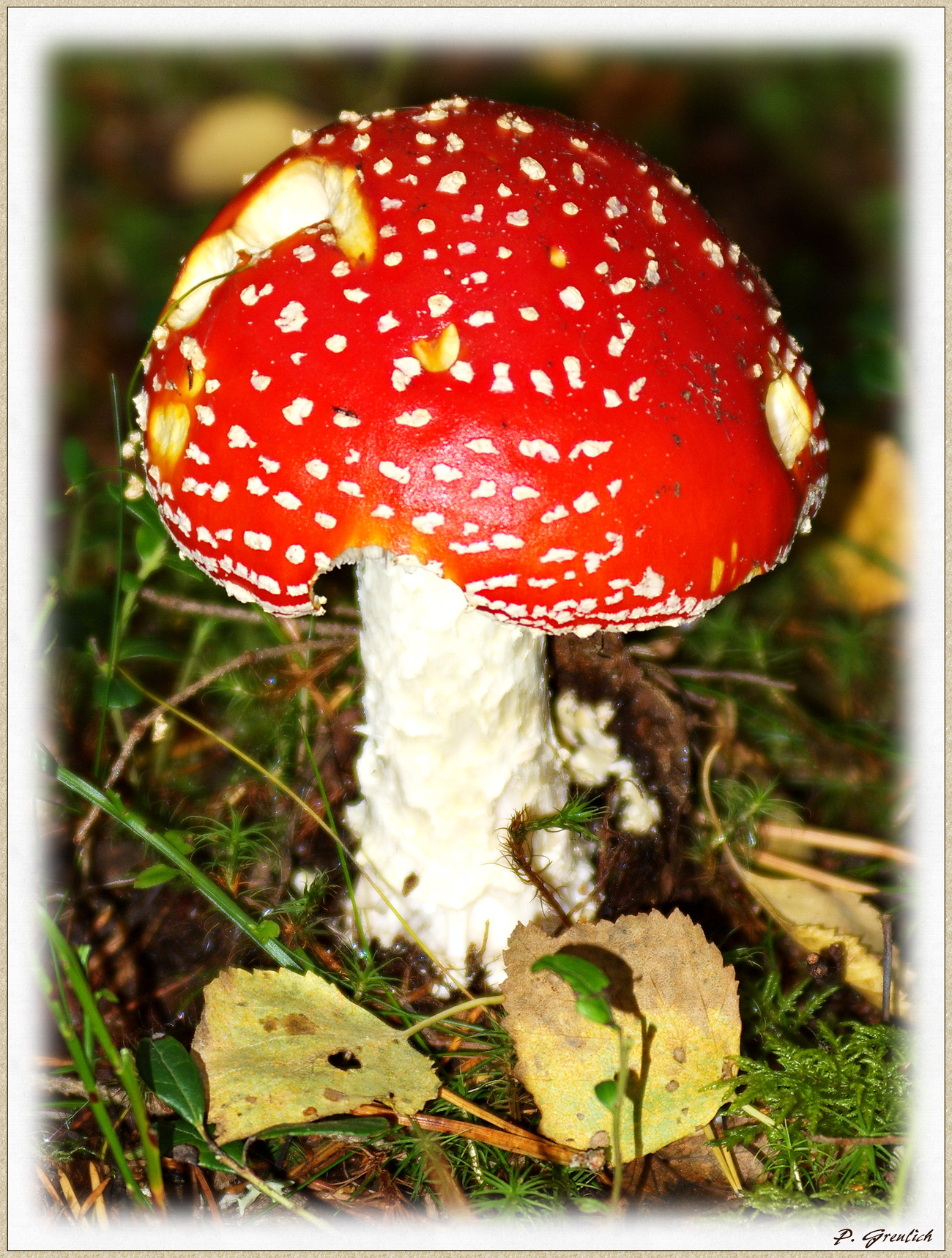 Hier noch ein aktueller Fliegenpilz. Weil er so schön bunt ist. Schnell noch ein Bild davon, bevor ihn die Vögel ganz aufessen. Angepickt ist er ja schon.