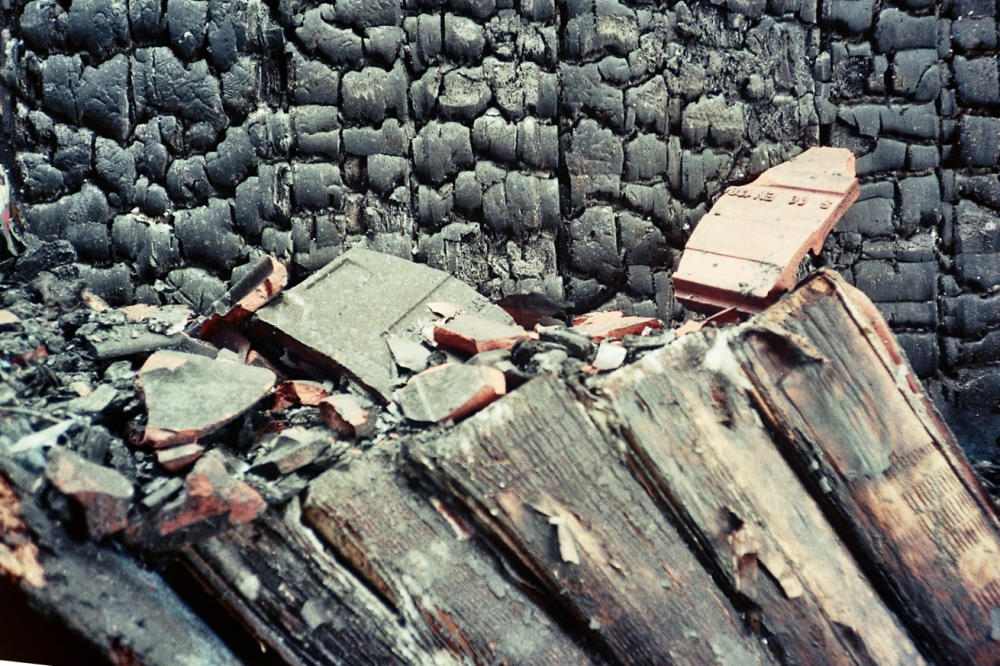 Das Feuer ist in dem ausgebauten Dachstuhl ausgebrochen, an eine heissen Nachmittag im August. Die ganze Familie (Uroma und Uropa, Oma, meine Frau und ich und die Kinder (damals zwei ein halb Jahre und vier Wochen alt)saßen im Garten. Durch Zufall sah meine Frau wie der Rahmen einer kleine Dachluke brannte. Gleich die Feuerwehr gerufen, die Kinder sind mit den Omas zu eienr Bekannten im Dorf. Die haben das ganze Chaos, das nun folgte, zum Glück nicht mit bekommen.