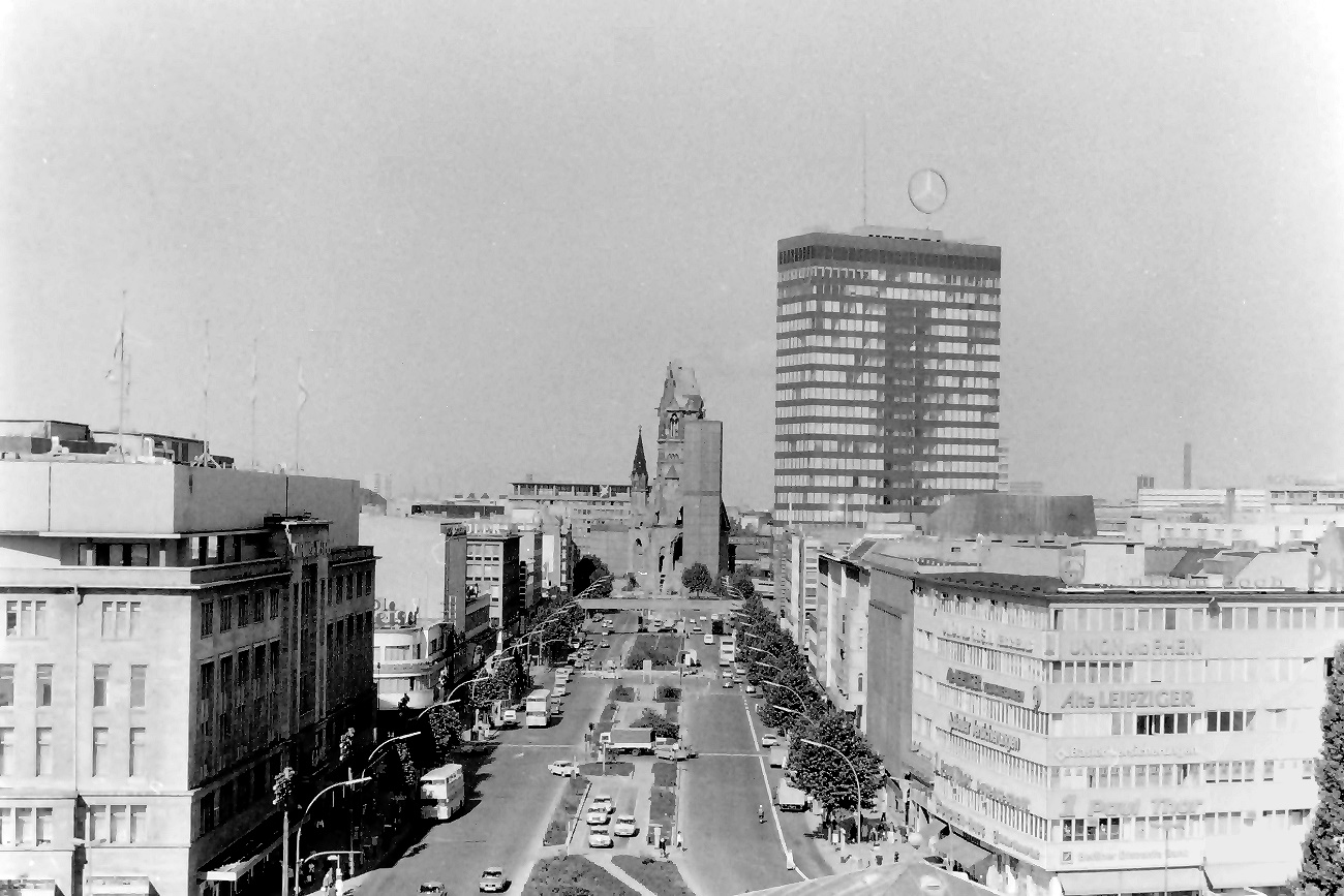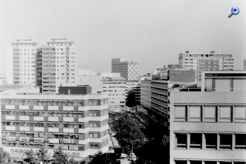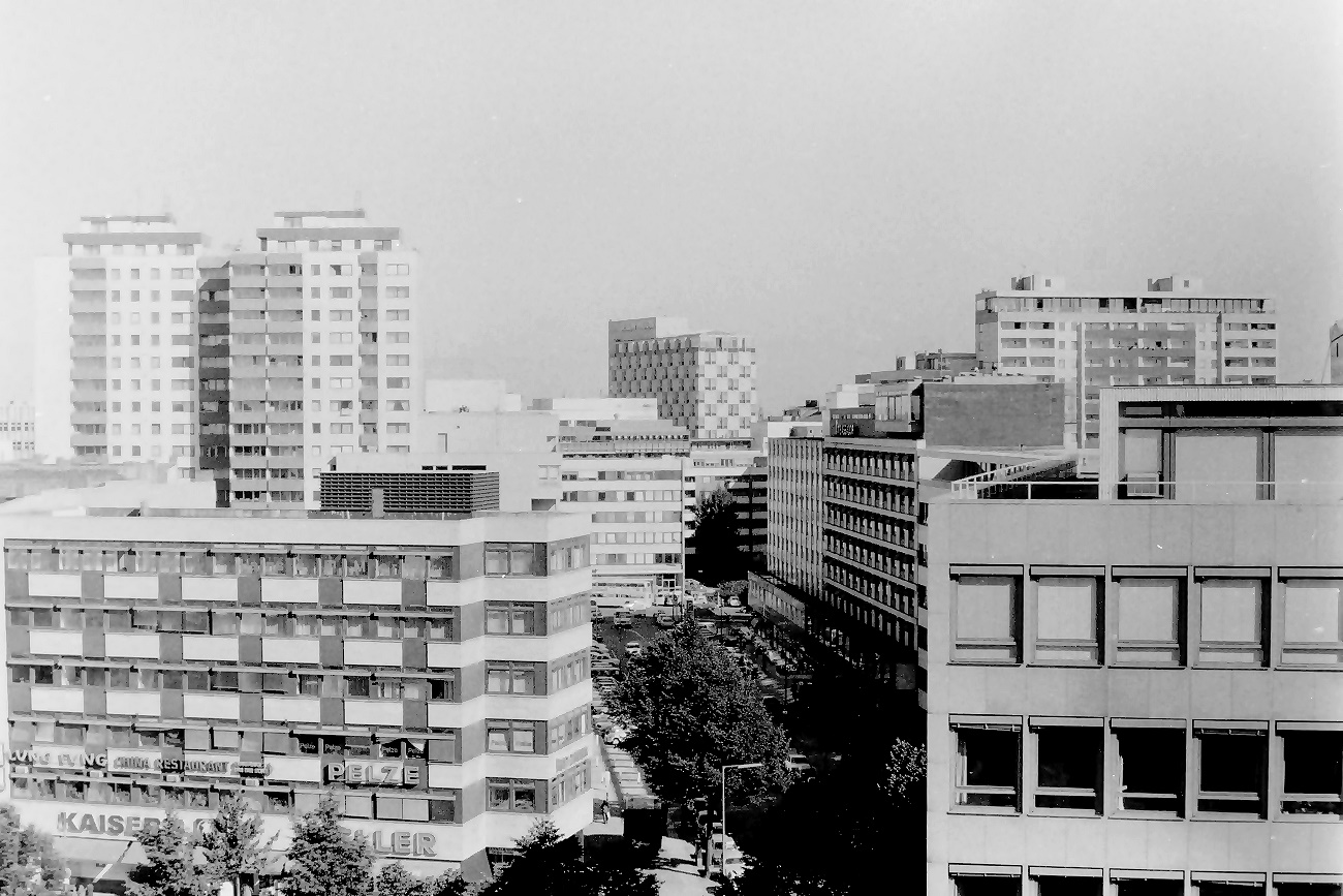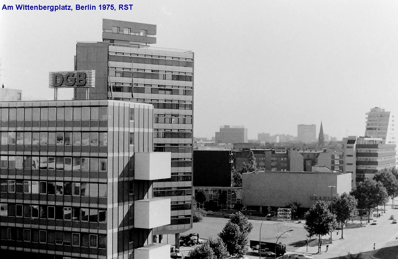 lange ist es her. 1975 habe ich vom Dach des Möbelhauses des KaDeWe am östlichen Rand des Wittenbergplatzes an der Südseite der Kleiststraße einige Aufnahmen der Umgebung aus luftiger Höhe vom Dach gemacht. Dabei begann der Schwenk mit Blickrichtung Nord-Nord-Ost und ging dann im Uhrzeigersinn weiter.