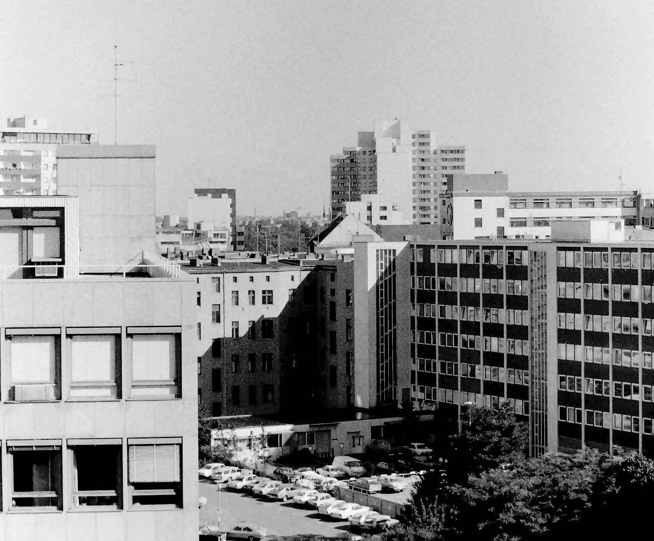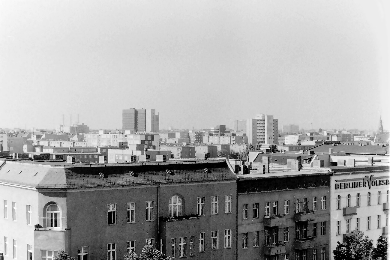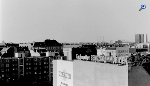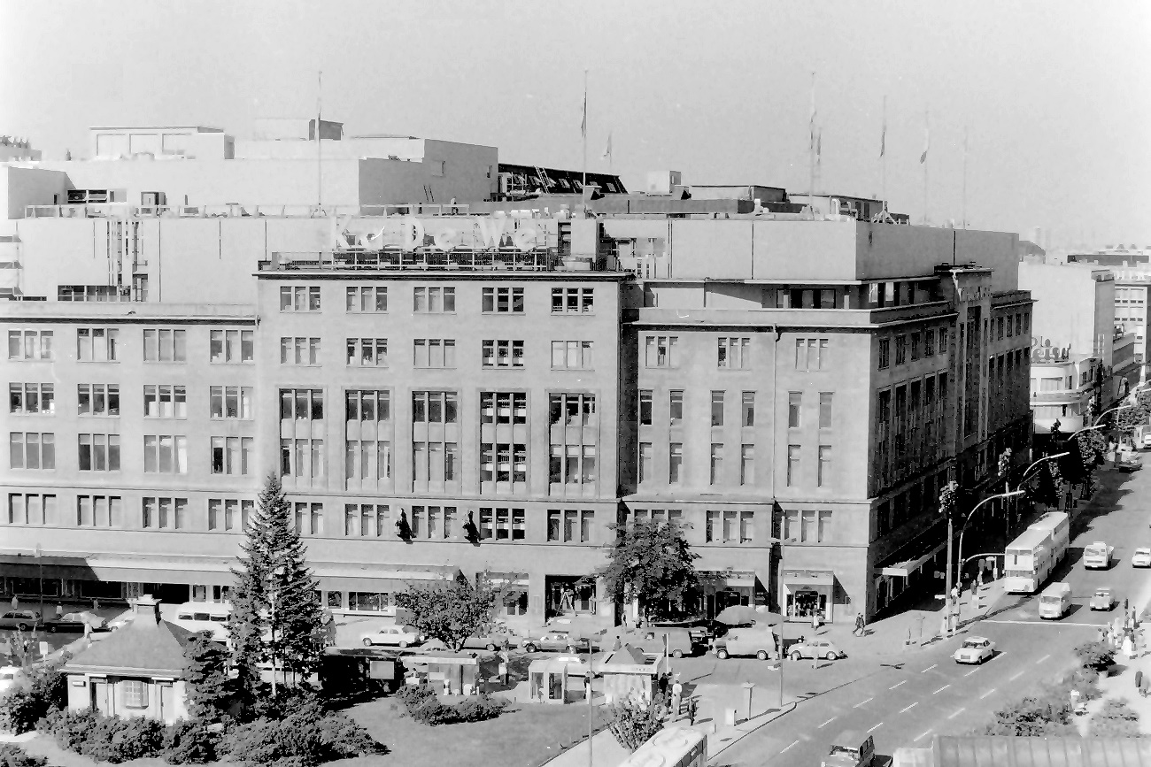 lange ist es her. 1975 habe ich vom Dach des Möbelhauses des KaDeWe am östlichen Rand des Wittenbergplatzes an der Südseite der Kleiststraße einige Aufnahmen der Umgebung aus luftiger Höhe vom Dach gemacht. Dabei begann der Schwenk mit Blickrichtung Nord-Nord-Ost und ging dann im Uhrzeigersinn weiter.
