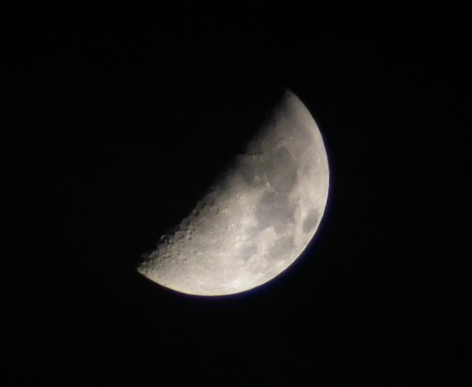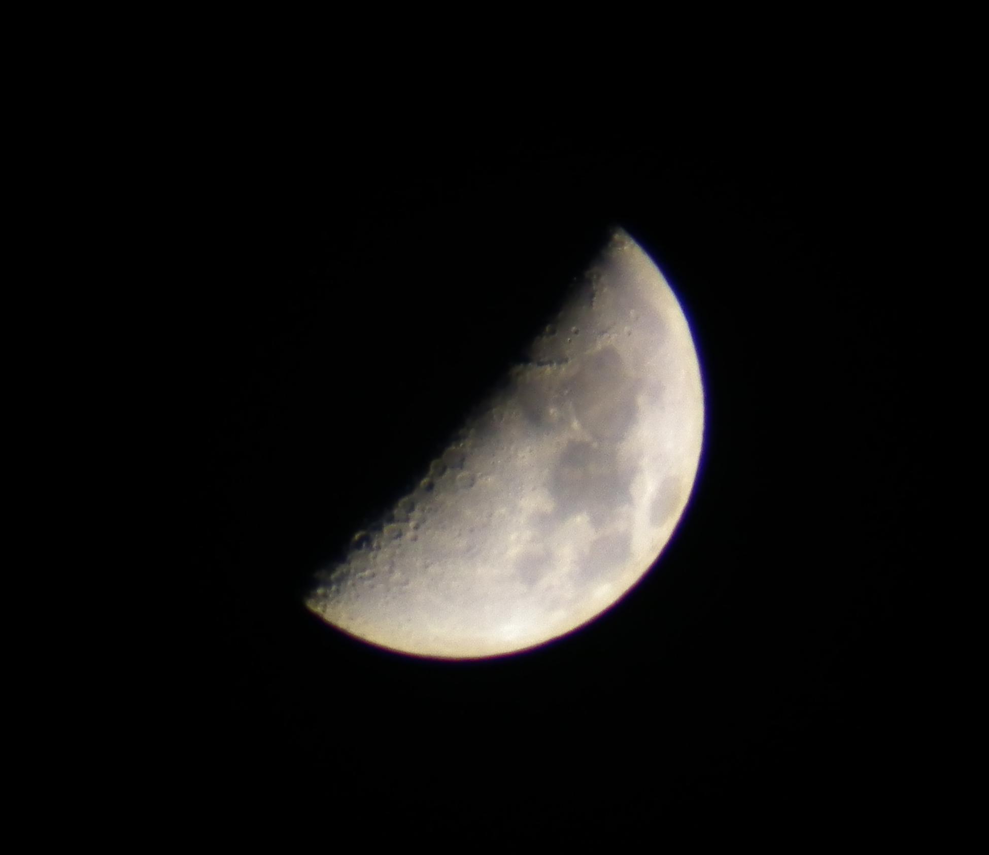 Wir erkennen am Mondrand eine bläuliche Verfärbung, nennt man das eine Accelleration? Ich scheb das dem nicht zugehörigen Telekonverter zu. Die zusammengebastelte Brennweite liegt um ein Meter, der Blendenverlust wurde ignoriert.