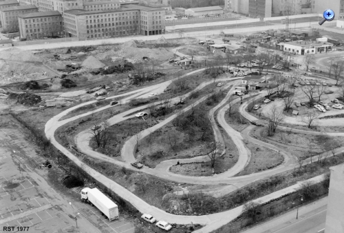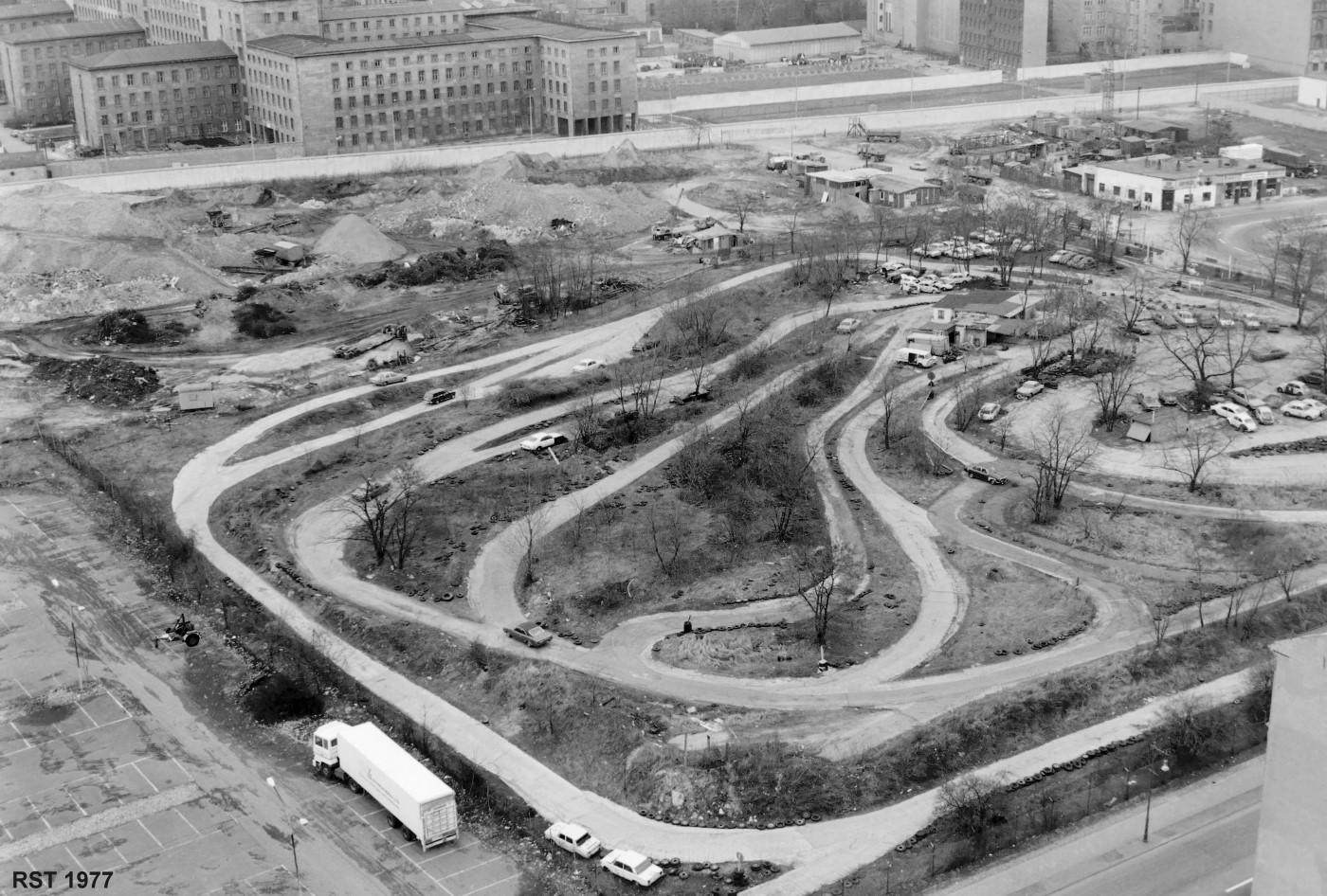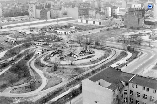 Ein Autofahr-Platz für führerscheinlose Anfänger, im Hintergrund die Berliner Mauer und das jetzige Finanzministerium.