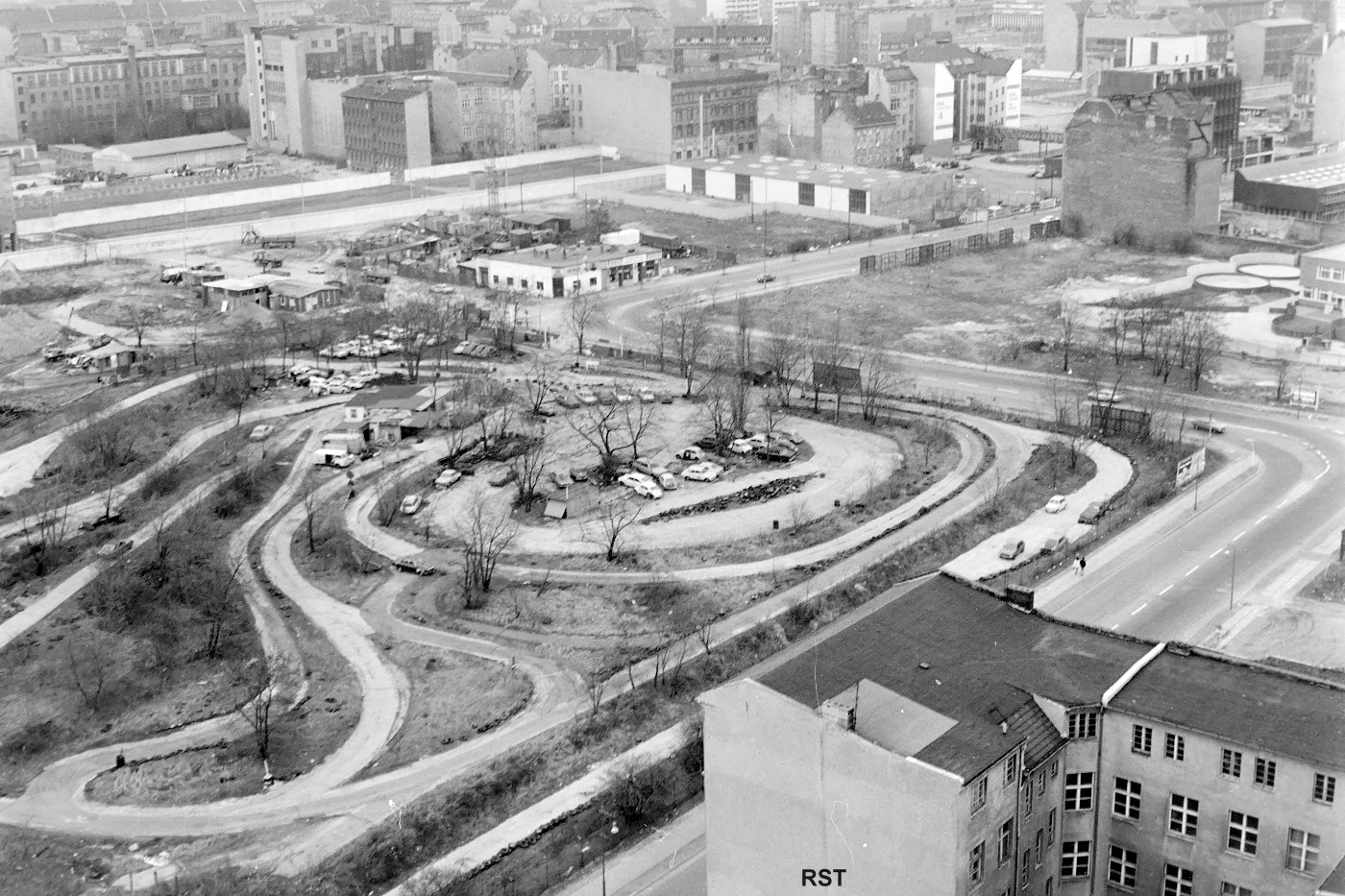 Ein Autofahr-Platz für führerscheinlose Anfänger, im Hintergrund die Berliner Mauer und hinten rechts die Friedrichstr.