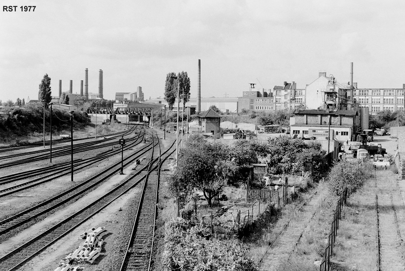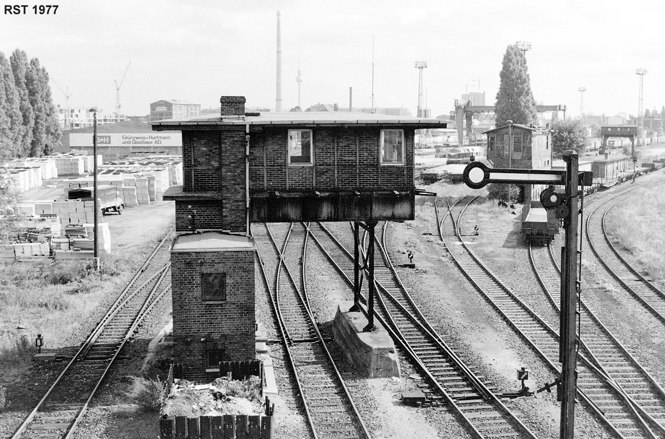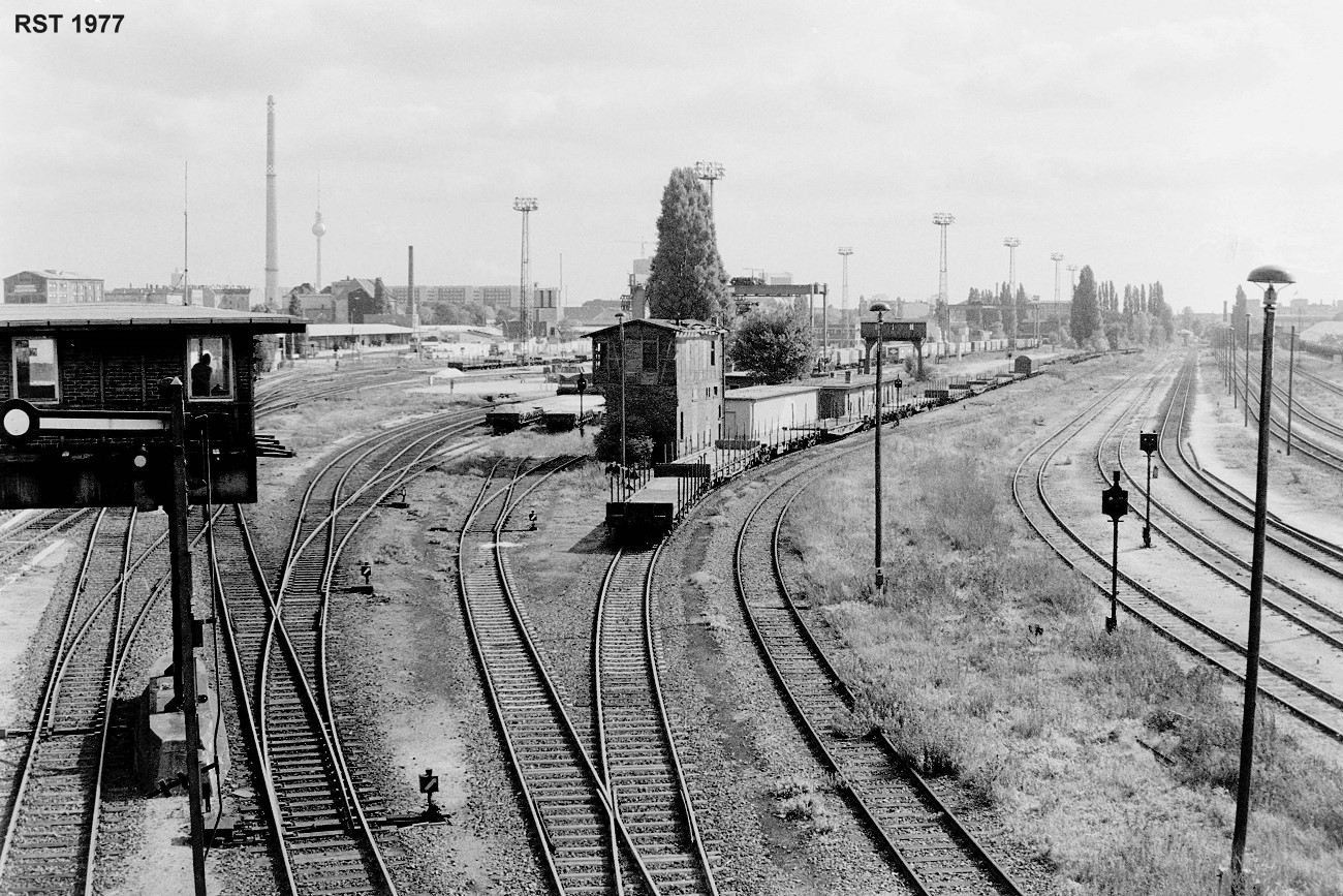 Analog SW: Blick von Eisenbahnbrücke in Berlin um 1977
