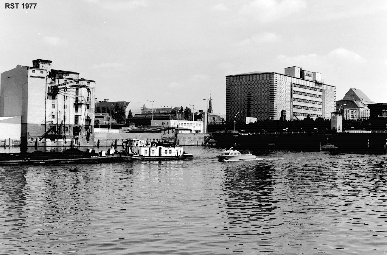 Die Spree unweit der Oberbaumbrücke. Blick von West-Berlin nach Ost-Berlin (die Spree gehörte bis zum Westberliner Ufer komplett zu Ostberlin) Ein Kind aus West-Berlin fiel am 11.5-1975 hier beim Spielen ins Wasser, die Grenzsoldaten (in einem solchen ähnlichen Boot) verhinderten die Rettung aus West-Berliner Seite. Westberliner Rettungswillige wurden unter Androhung von Waffengewalt zurückgewiesen. Das Kind ertrank im Beisein der Grenzer des Grenzsicherungsboots.