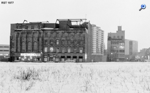 Die Ortslage Friedrichstr. 12. Rechts ist die Firma Berger Schweiss-Technik zu sehen. Im Hintergrund das damalige Postscheckamt-Hochhaus. Das Gebiet wurde durch Hausabrisse saniert.