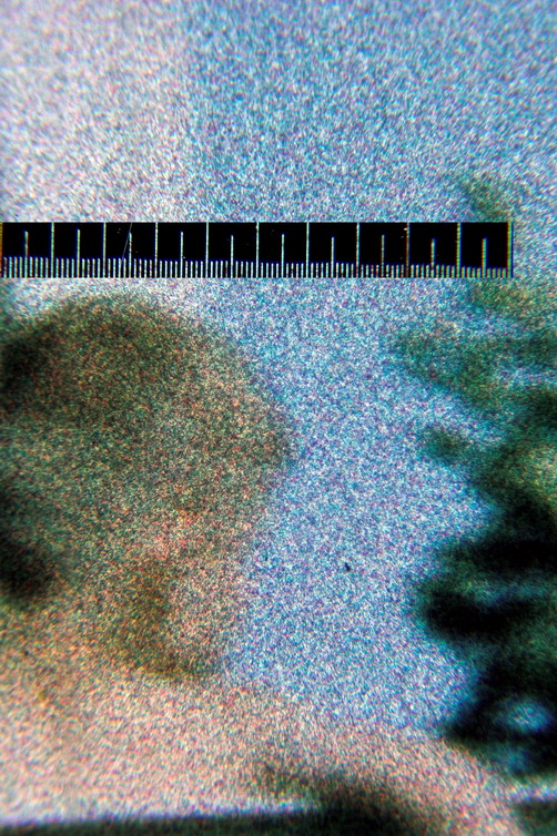 Unter dem Mikroskop sieht man das Korn. Der Maßstab ist in 1/100 mm unterteilt.