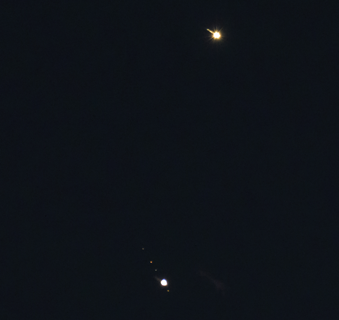 Hallo Hannes, ich hab mich heute auch mal an der Konjnktion versucht. Leider ein wenig spät, es war schon zu dunkel. Zur blauen Stunde kann man kürzer belichten. Immerhin kommen die Monde des Jupiters gut raus, die Venus überstrahlt allerdings ziehmlich. Vielleicht habe ich morgen noch einen Versuch. Aufgenommen mit 500mm Nikkor bei 6,3 1/20s beoi 2000 ISO an Z9