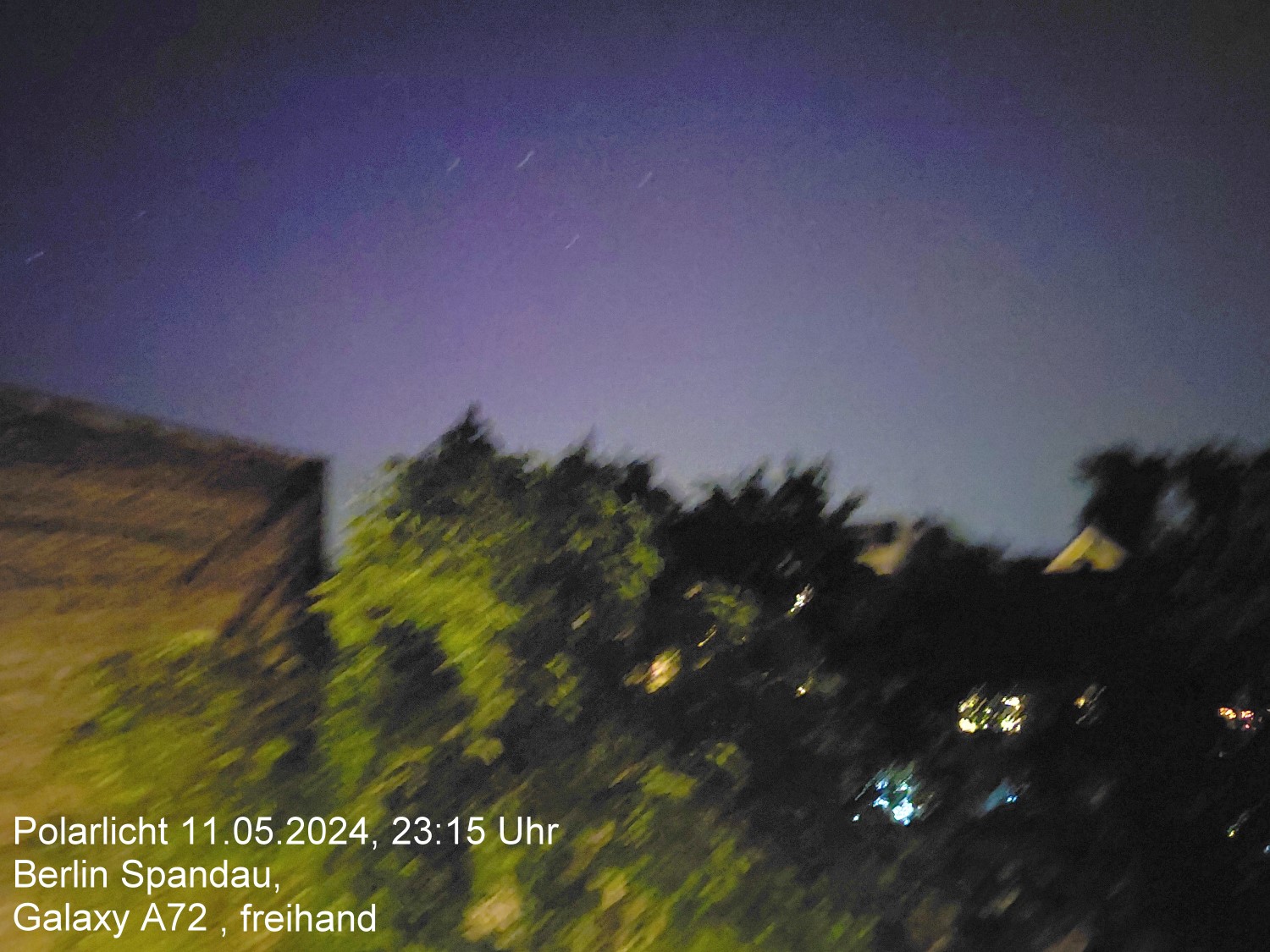 auch in Berlin waren Polarlichter zu sehen, gestern Nacht mal eben so das Smartphone Galaxy A72 nach Norden freihand aus dem Laubengang gehalten. Leider wegen der langen Belichtungszeit verwackelt, aber immerhin. Mit bloßen Augen schwerer zu erkennen, aber nach Kontrast- und Farbstärke- und Helligkeit-Anpassungen doch als Polarlicht erkennbar: