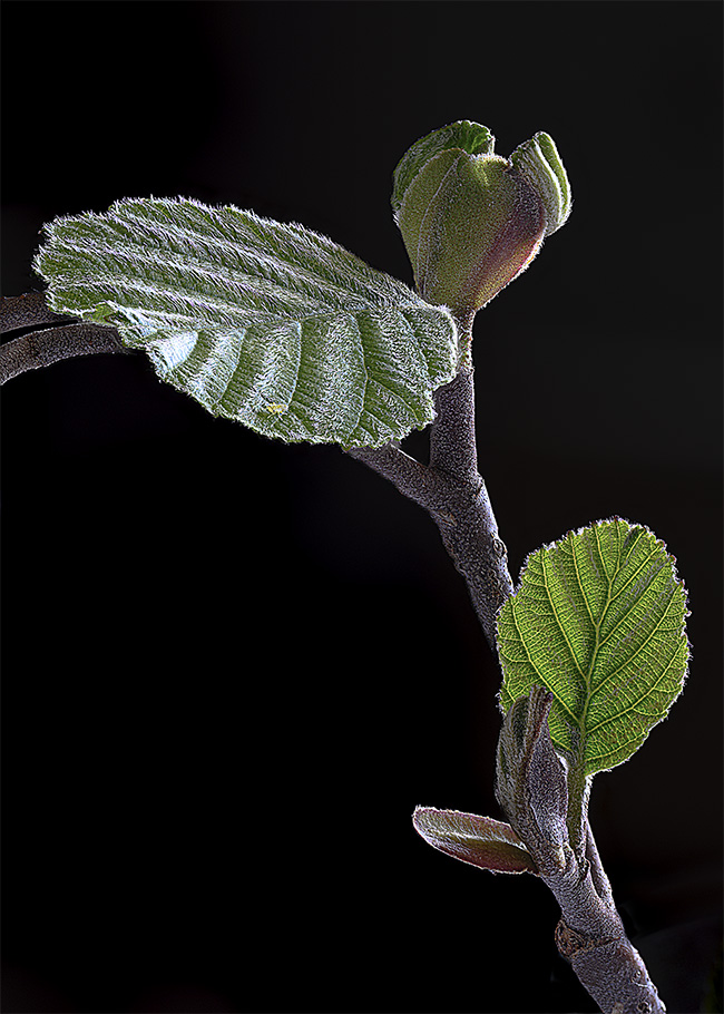 an einem Erlenzweig, der in der Vase ausgetrieben hatte, saß oben auf dem Blatt eine Laus. Also hab ich wieder mal mein Supermacro an die Kamera geschraubt. Die Blattlaus hatte sich inzwischen auf die Unterseite des Erlenblattes zurückgezogen, wo auch noch zwei andere herum stolzierten.. Dieser Microkosmos ist schon interessant und hat mich den ganzen Tag beschäftigt.