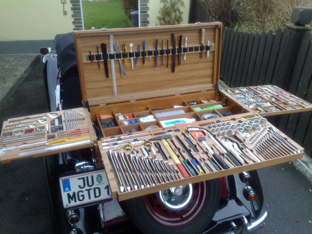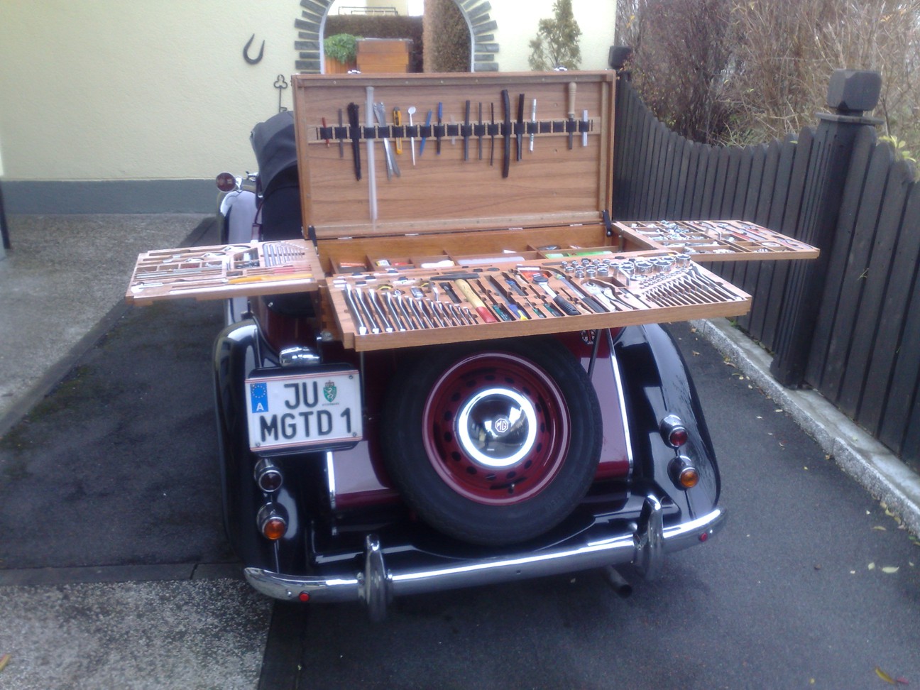 Hab soeben im Archiv bei meinem Bruder (ein Oldtimerfan) ein Bild vom traumhaften MG TD von Markus entdeckt! (Wolfgangsee 2012) Im Koffer am Heck sind keine Oldiekameras oder die Jause versteckt sondern das Bordwerkzeug in CNC-gefrästen Einlegeböden. @ Markus: zeig uns doch ein Bild von deiner Werkzeugordnung