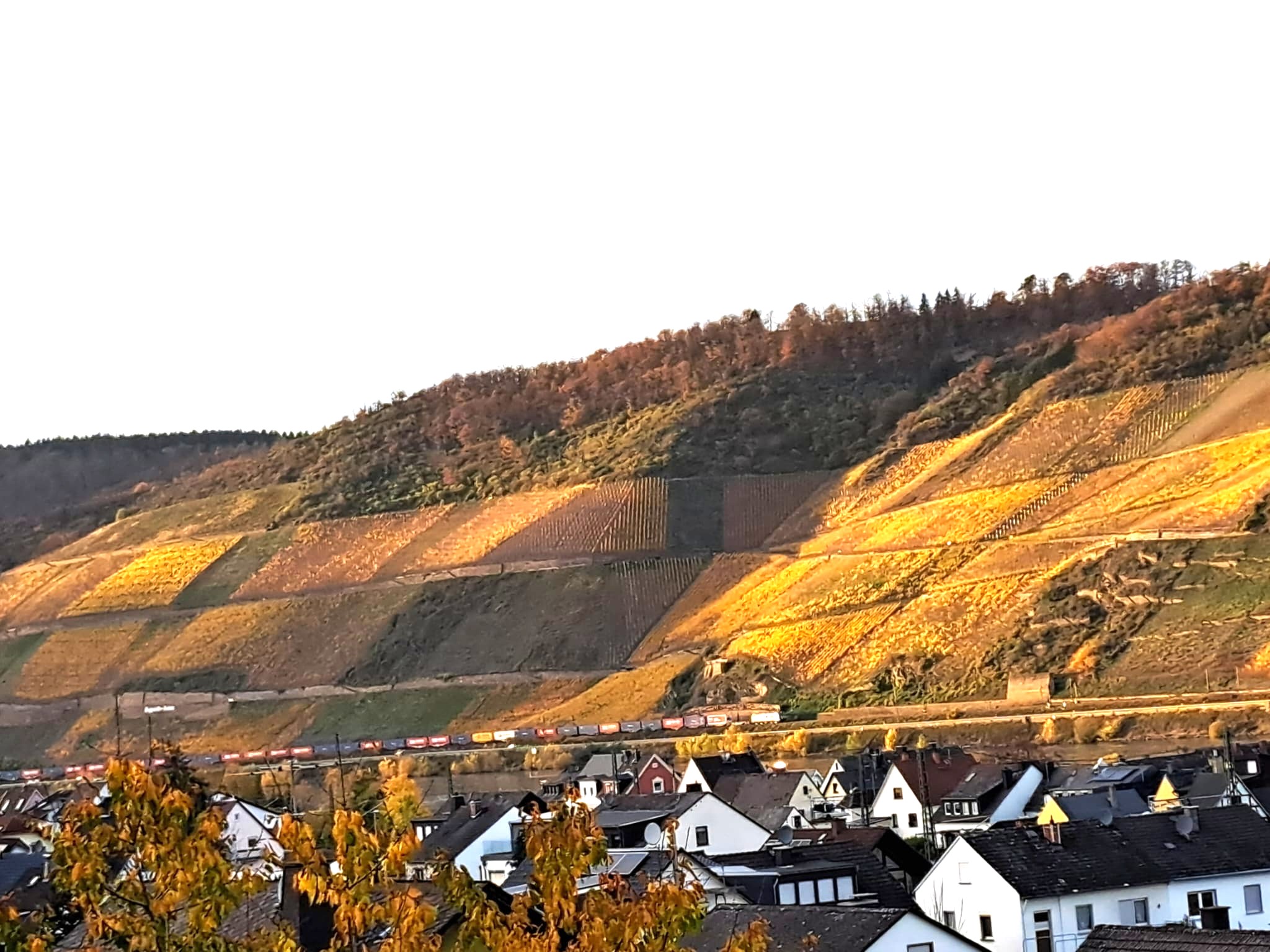 da man das jeden Tag vor Augen hat, wird es zur Gewöhnung. Wenn man Richtung Norden schaut, sieht man die Weinberge, auf der anderen Straßenseite Richtung Süden ist man direkt im Wald auf dem Rheinsteig bzw. Langhals-Wanderweg und auf der Hanghöhe das Schlösschen Liebeneck, im Westen schaut man auf einen Teil der größten Rheinschleife, im Osten sieht man die künstliche Halbinsel zum Stauen des Fahrwassers , das Ritt. Am Mittelrhein reiht sich Burg an Burg rechts und links des Rheins bis Rüdesheim. Leider gibt es da einen riesigen Wermutstropfen - die Bahnlinie, eine sehr stark befahrene Strecke für den Güterverkehr, mit teils uralten Waggons, die zum Beispiel ab der Schweiz nicht mehr fahren dürfen. Für die Bewohner in der Nähe der Bahngleise ist das sehr belastend. Trotzdem ist die Gegend sehr schön und zieht viele Touristen an.