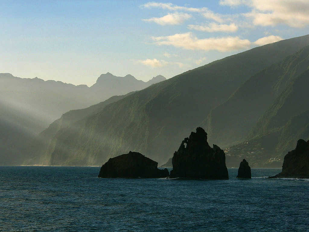 Morgen an der Nordküste bei Porto Moniz. Die Basaltberge der nur 57 km langen Insel ragen bis auf fast 2000 m auf.