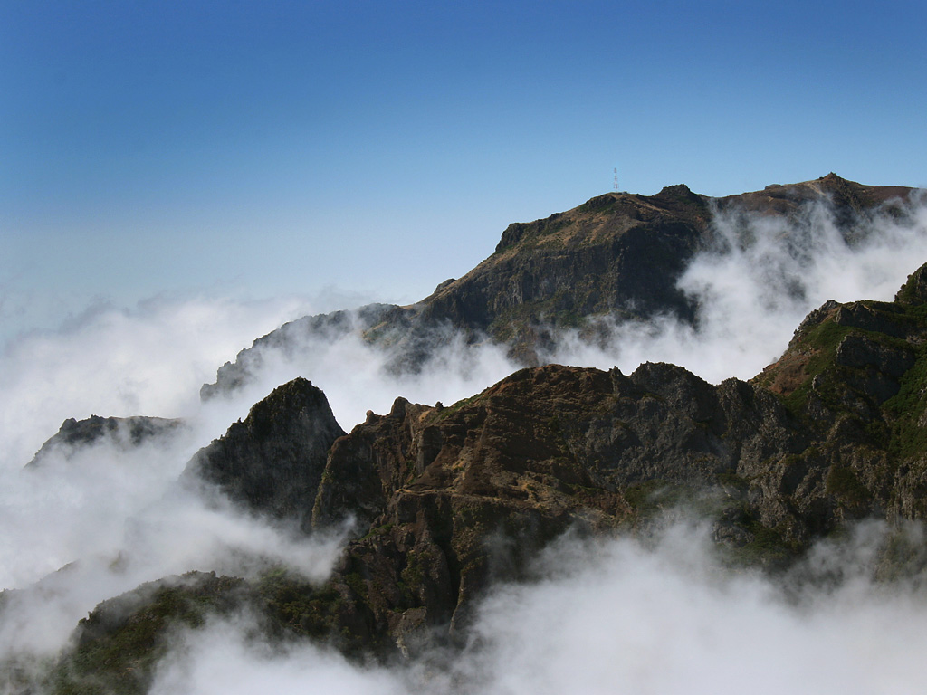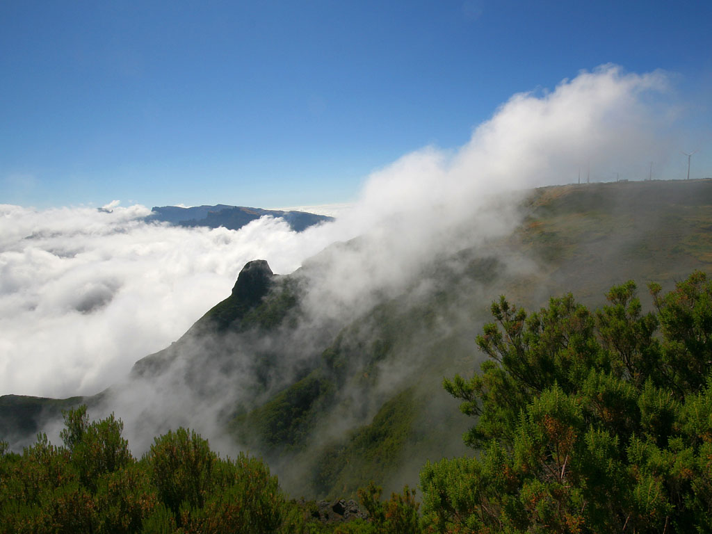 Der Pico do Arreiro, der dritthöchste Berg der Insel mit 1805 m, taucht aus dem Nebel auf.