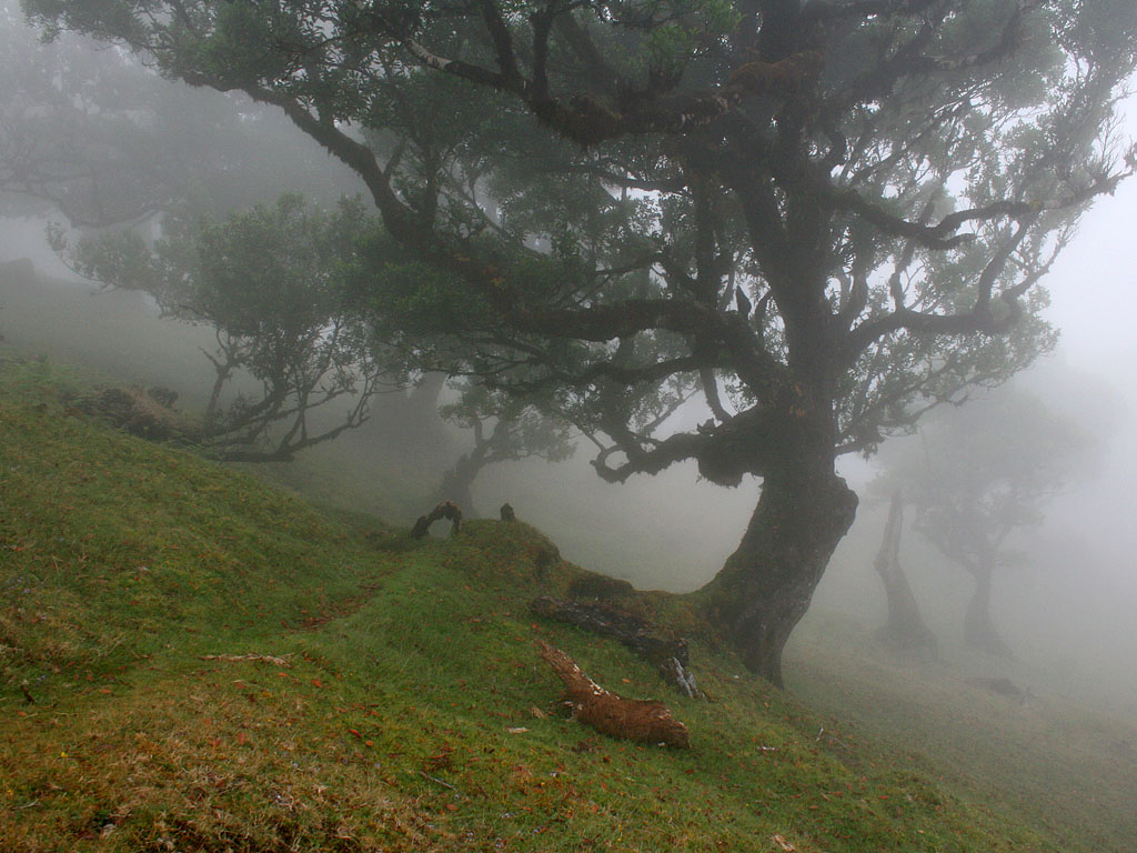 Im Lorbeerwald an der Nordseite der Insel. Der feuchte Nebel kondensiert an den Blättern der Lorbeerbäume und fällt auch bei Schönwetter auf der Insel als Regen zu Boden.