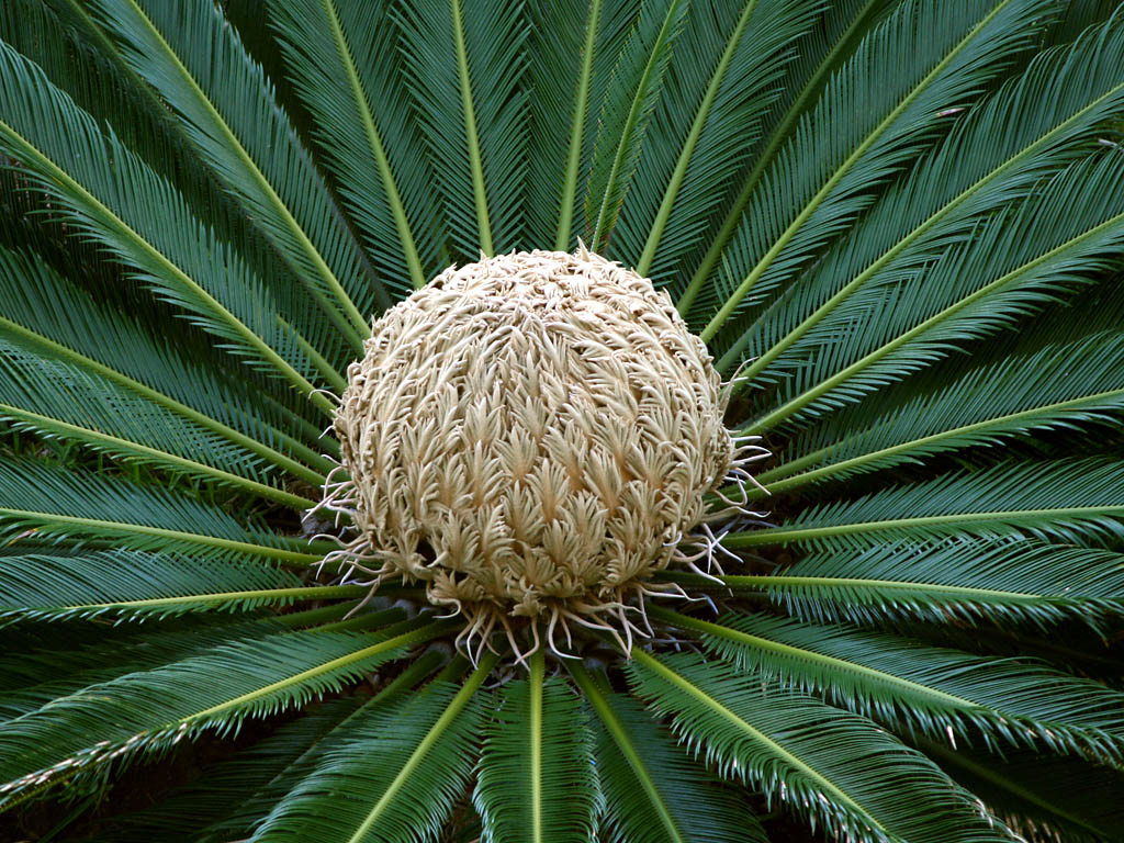 Ein Palmfarn mit der kugelförmigen Blüte.