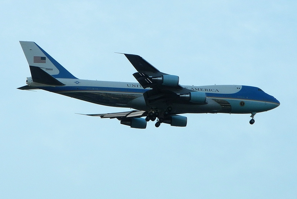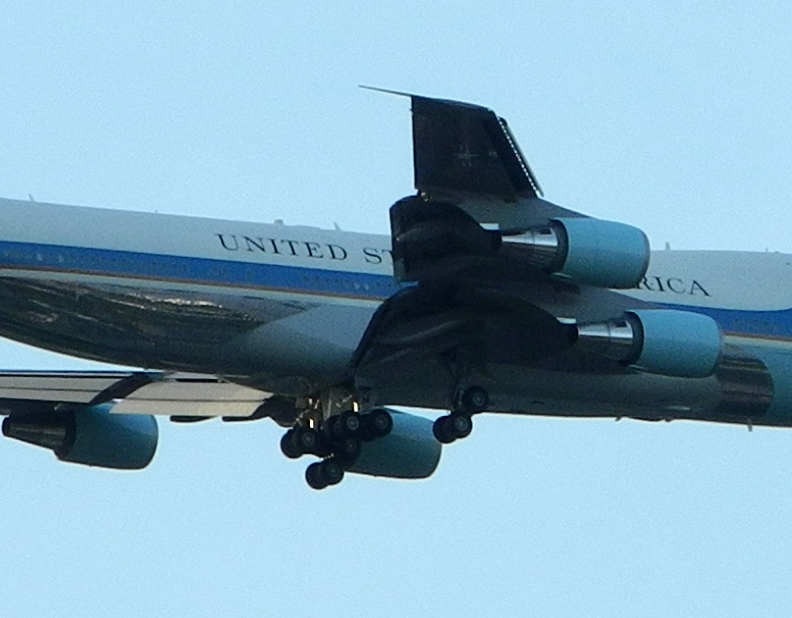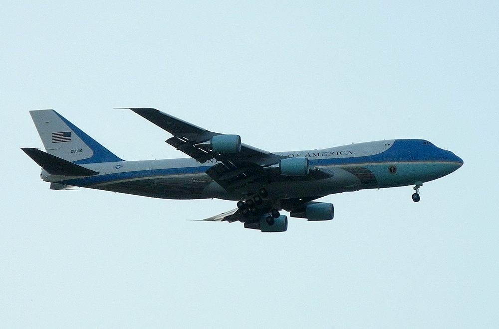 gerade ist mir noch eingefallen: Der Präsident kommt doch gleich. Schnell die P7100 ( http://www.blende-und-zeit.sirutor-und-c...60&thread=3 ) gegriffen, beim Laufen zum Nordlaubengang des Hauses schnell auf "Landschaft, unendlich" gestellt. Kamera hoch, Tele voll: Und schon kam die Präsidentenmaschine eingeschwebt, ca 900 von meinem Haus entfernt:
