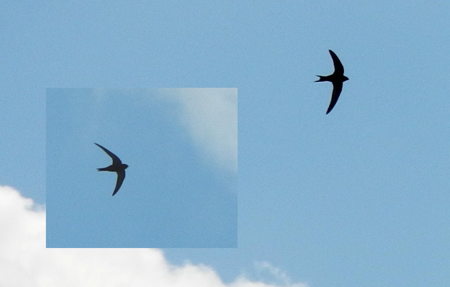 habe mal die P7100 hochgehalten, um ein paar "Nahaufnahmen" von den Swifts zu machen, denn zumeist fliegen die in nur 5 - 10 Meter herum. Aber heute nach der Gewitternacht ist es relativ kühl draußen und die Mauersegler hielten sich nun in ca. 50 bis 100 Meter Höhe auf, deshalb nur diese "Nahaufnahmen":